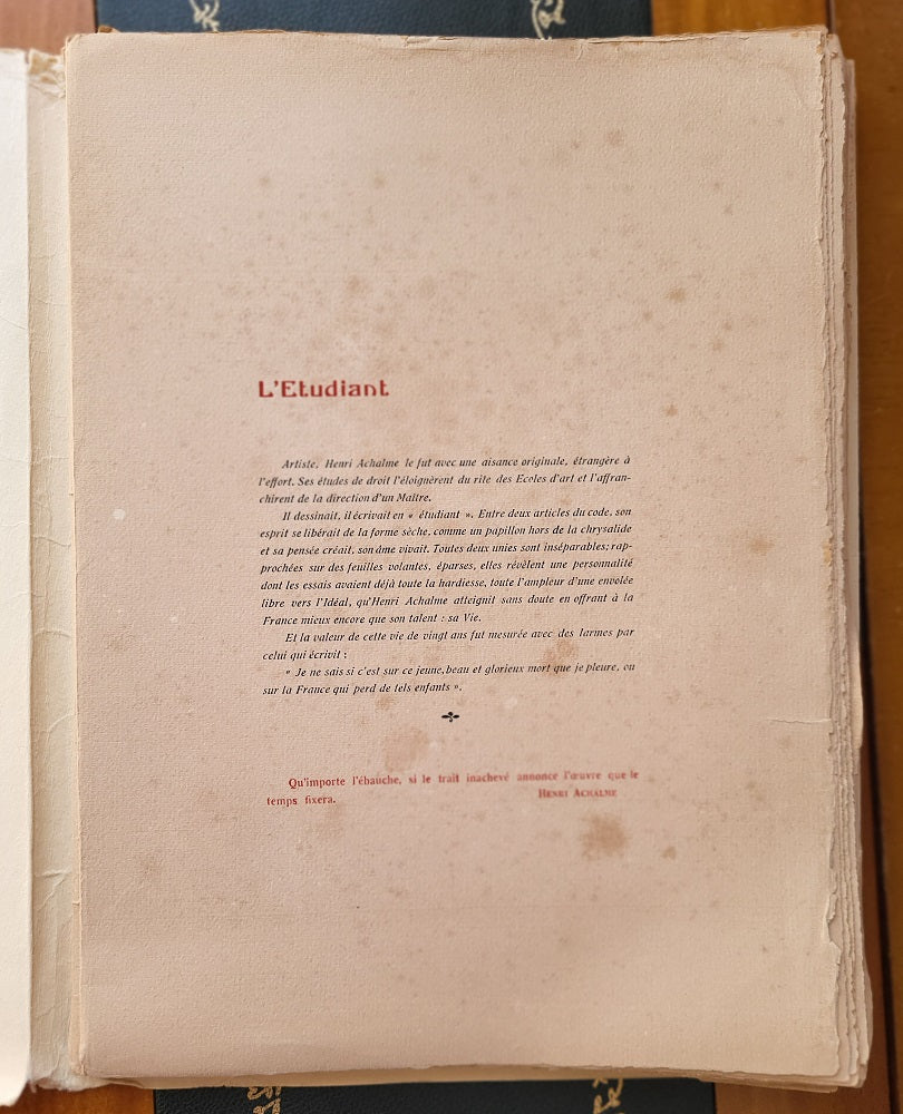 1er fascicule L'étudiant p. 1-13 Illustré par des dessins de Pierre Henri Achalme (Paris, 9 juin 1894 † Aspirant au 148ième Régiment d'Infanterie, mort pour la France à Moulin-sous-Touvent (Oise) le 16 juin 1915 (Inhumé dans la Nécropole Nationale de Tracy-le-Mont (Oise)) fils du docteur Pierre Jean Achalme (Riom (Puy-de-Dôme), 30 juin 1866 † Paris, 17 février 1936 (inhumé au Château de Maubec à Escoutoux (Puy-de-Dôme) propriété de la famille Achalme) et de l'écrivain féministe Berthe Lucie Achalme née Riffaud (Paris, 26 avril 1869 + Paris, 15 mars 1931 (inhumé au Château de Maubec à Escoutoux (Puy-de-Dôme)) auteur du Maître du pain.