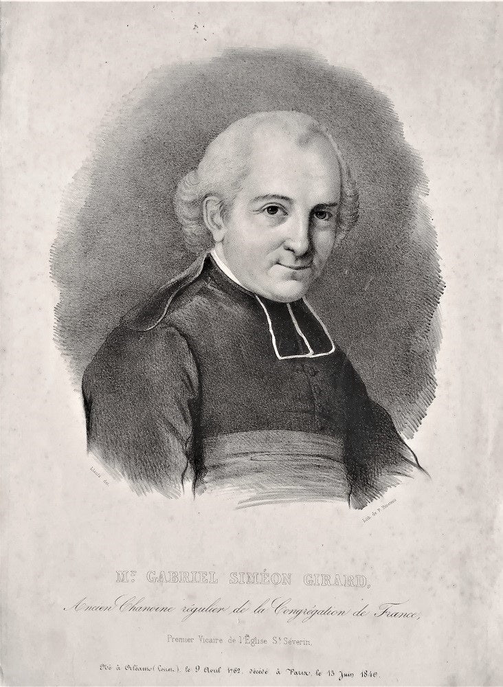 Estampe/Lithographie imprimée par P. Bineteau pour Jacques François Gauderique Llanta (Perpignan, 1807 † Paris, 1864) « fournisseur attitré de l’imagerie religieuse de St Sulpice ». Bibl. : Bdf… du 29 août 1840, n°1219 ; Béraldi, vol. 9, p.185-186 ; IFF1800, vol. 14, p.372-, n°39. Hist. : Gabriel Siméon Girard (Orléans, 9 avril 1762 † Paris, 13 juin 1840), premier vicaire de St Severin à Paris, ancien chanoine régulier de la Congrégation de France. Notre épreuve : la feuille 330*237 mm, le sujet 220*185. Voir la Notice sur alcesteart.com.