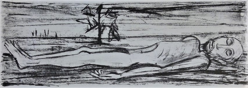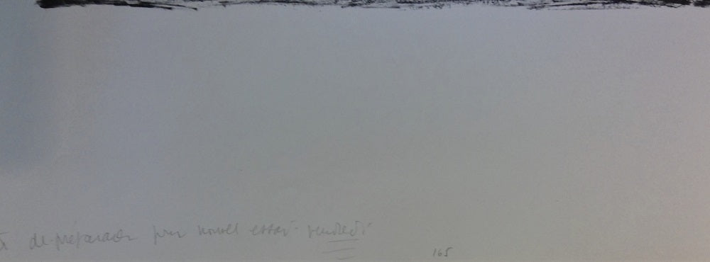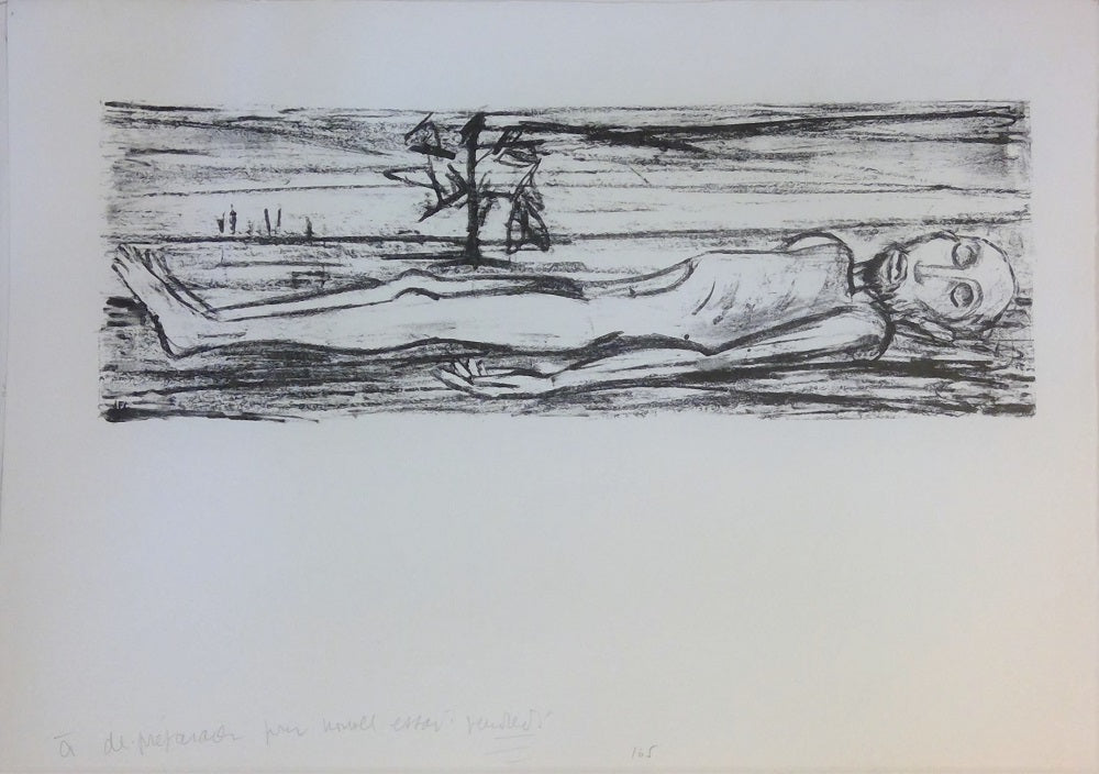 Lithographie de Jean Frédéric Loisel (Paris, 1928 † ?) pour Saint François d'Assise (en feuilles, édition illustrée de 12 lithographies en noir, tirées à 75 exemplaires sur vélin, 535*385 mm). Le sujet 155*460 mm. Au crayon, en bg à de préparer pour nouvel essai vendredi.