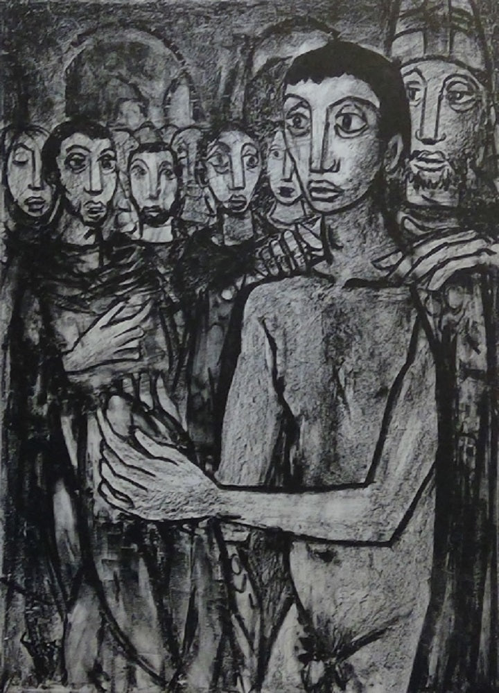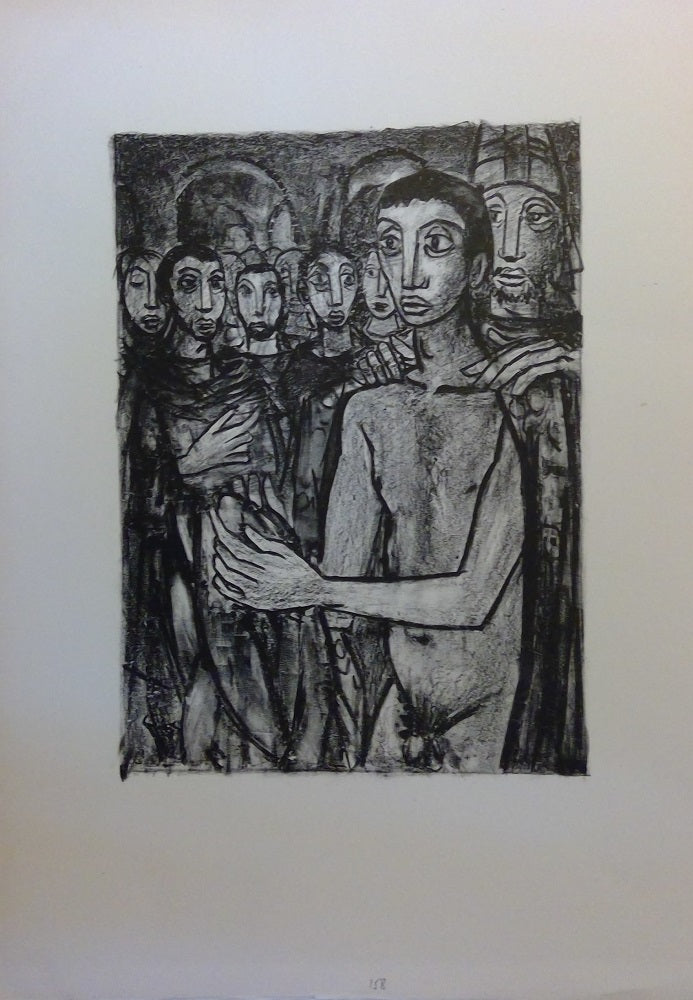 Lithographie de Jean Frédéric Loisel (Paris, 1928 † ?) pour Saint François d'Assise (en feuilles, édition illustrée de 12 lithographies en noir, tirées à 75 exemplaires sur vélin, 535*385 mm). À l'issue de ce procès au tribunal de l'évêque d'Assise Guido Ier, François rompt la relation avec son père en lui laissant, symboliquement, ses habits. désormais je peux dire : Notre Père qui êtes aux cieux, puisque c'est à Lui que j'ai confié mon trésor et donné ma foi. Il va alors se placer sous la protection de l'évêque Guido, qui l'enveloppe de sa cape, pour signifier que l'Église le prend sous sa juridiction et reconnaît en lui désormais un religieux, au sens juridique du terme. Le sujet 340*245 mm. Au crayon, sous le sujet à g EA, à d Loisel.