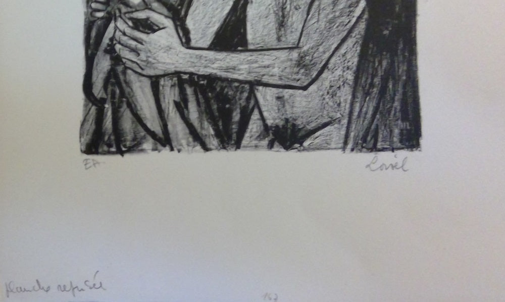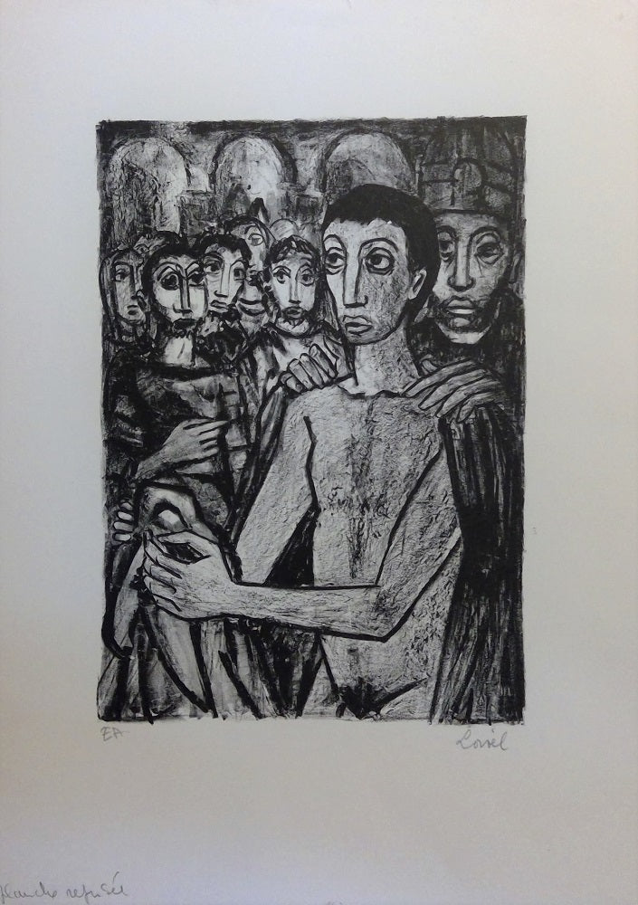 Lithographie de Jean Frédéric Loisel (Paris, 1928 † ?) pour Saint François d'Assise (en feuilles, édition illustrée de 12 lithographies en noir, tirées à 75 exemplaires sur vélin, 535*385 mm). À l'issue de ce procès au tribunal de l'évêque d'Assise Guido Ier, François rompt la relation avec son père en lui laissant, symboliquement, ses habits. désormais je peux dire : Notre Père qui êtes aux cieux, puisque c'est à Lui que j'ai confié mon trésor et donné ma foi. Il va alors se placer sous la protection de l'évêque Guido, qui l'enveloppe de sa cape, pour signifier que l'Église le prend sous sa juridiction et reconnaît en lui désormais un religieux, au sens juridique du terme. Le sujet 350*245 mm. Au crayon, sous le sujet à g EA, à d Loisel., en bg planche refusée.