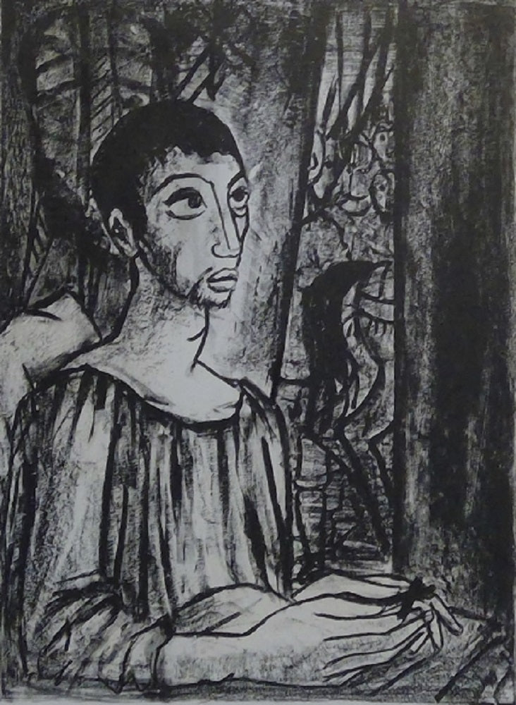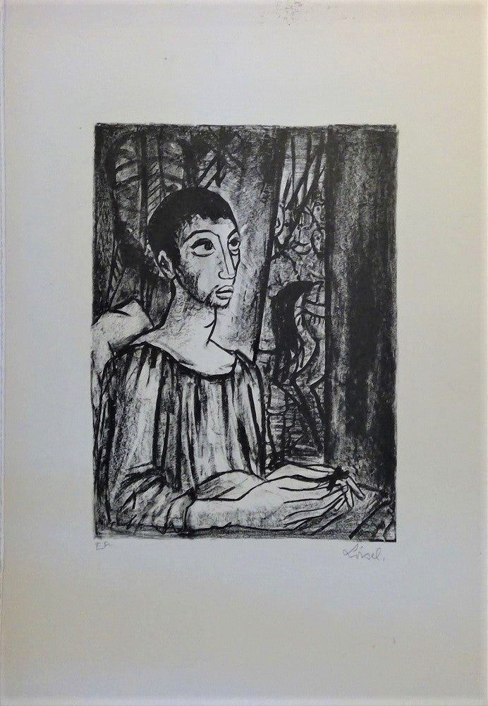 Lithographie de Jean Frédéric Loisel (Paris, 1928 † ?) pour Saint François d'Assise (en feuilles, édition illustrée de 12 lithographies en noir, tirées à 75 exemplaires sur vélin, 535*385 mm). Épreuve évoquant le songe de François malade Spolète alors qu’il doit rejoindre l'armée de Gautier III de Brienne. Monogrammée à la pointe dans la planche en bg JFL. Au crayon sous le sujet à g E. A., à d signature. Cette épreuve 565*383 mm. Moisissures dans la marge supérieure. Le sujet 320*235 mm.