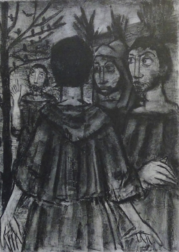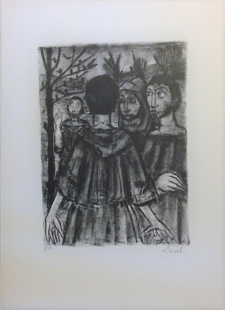 Lithographie de Jean Frédéric Loisel (Paris, 1928 † ?) pour Saint François d'Assise (en feuilles, édition illustrée de 12 lithographies en noir, tirées à 75 exemplaires sur vélin, 535*385 mm). Épreuve évoquant François émerveillé par une foule d’oiseaux sur un arbre, et, sous l’inspiration de l’Esprit de Dieu, disant à ses compagnons Attendez-moi ici sur la route, car je veux aller prêcher à mes frères les oiseaux. Monogrammée à la pointe dans la planche en bd JFL. Le sujet 340*280 mm. Au crayon, sous le sujet à g EA, à d Loisel.