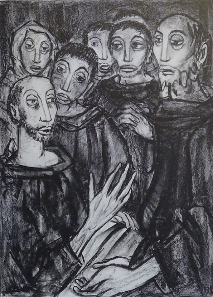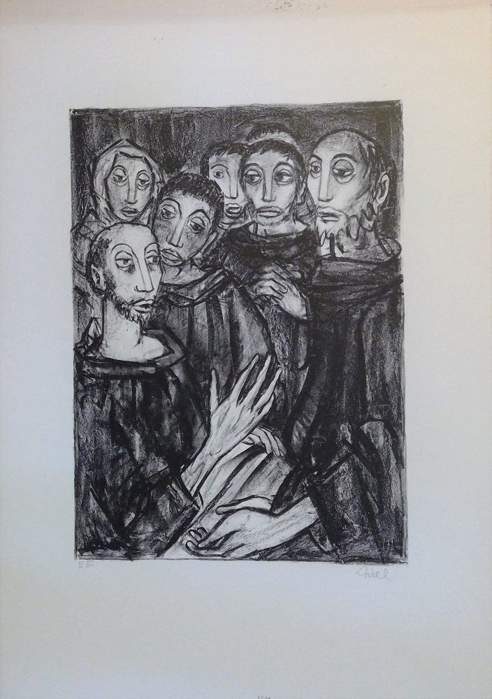 Lithographie de Jean Frédéric Loisel (Paris, 1928 † ?) pour Saint François d'Assise (en feuilles, édition illustrée de 12 lithographies en noir, tirées à 75 exemplaires sur vélin, 535*385 mm). Monogrammée à la pointe dans la planche en bd JFL. Le sujet 345*255 mm. Au crayon, sous le sujet à g EA, à d Loisel.