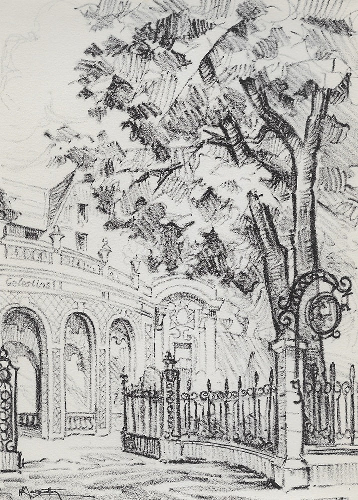Lithographie de René Margotton (Roanne (Loire), 18 novembre 1915 † Paris, 22 décembre 2009) d’après son aquarelle, Sbg, 219*158 mm , tirée sur la presse à bras des ateliers de Liabaud et Ouvrard à Vichy. Défet de l’ouvrage de Maurice Constantin-Weyer (Bourbonne-les-Bains (Haute-Marne), 24 avril 1881 † Vichy, 22 octobre 1964) Vichy et son histoire des origines à nos jours Vichy, Szabo, 1947, in 4, 121pp.-1f.- 43 hors-texte en noir et en couleurs dont 19 lithographies de René Margotton, 400 ex. tirés à part sur vélin spécial Johannot, portant la mention Édition originale.