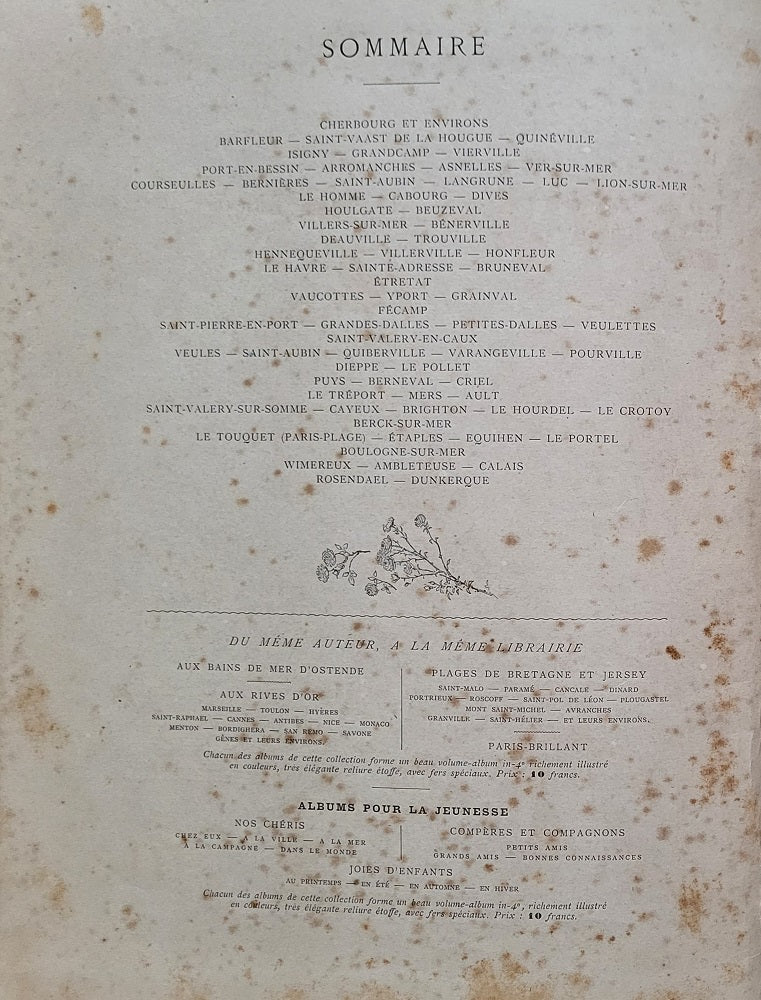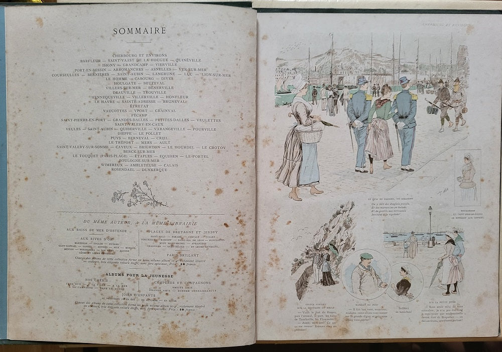 Plages normandes Plages du nord de Cherbourg à Rosendael-Dunkerque Editions Plon, Paris In 4°, 1899 reliure percaline Verte Premier Plat avec titre en couleurs et or Quatrième Plat avec vignette dorée nombreuses illustrations en couleurs et N&B par l'illustrateur, caricaturiste, aquarelliste et aquafortiste Maurice Charles Mathieu Bonvoisin, dit MARS (Verviers (Belgique), 1849 † Monte-Carlo, 1912) 32 pages + 5 pages publicitaires en fin d'ouvrage Epidermures et dos fendus. 325*250 mm.
