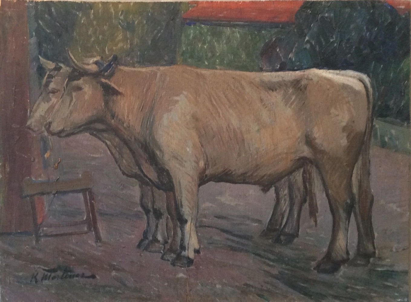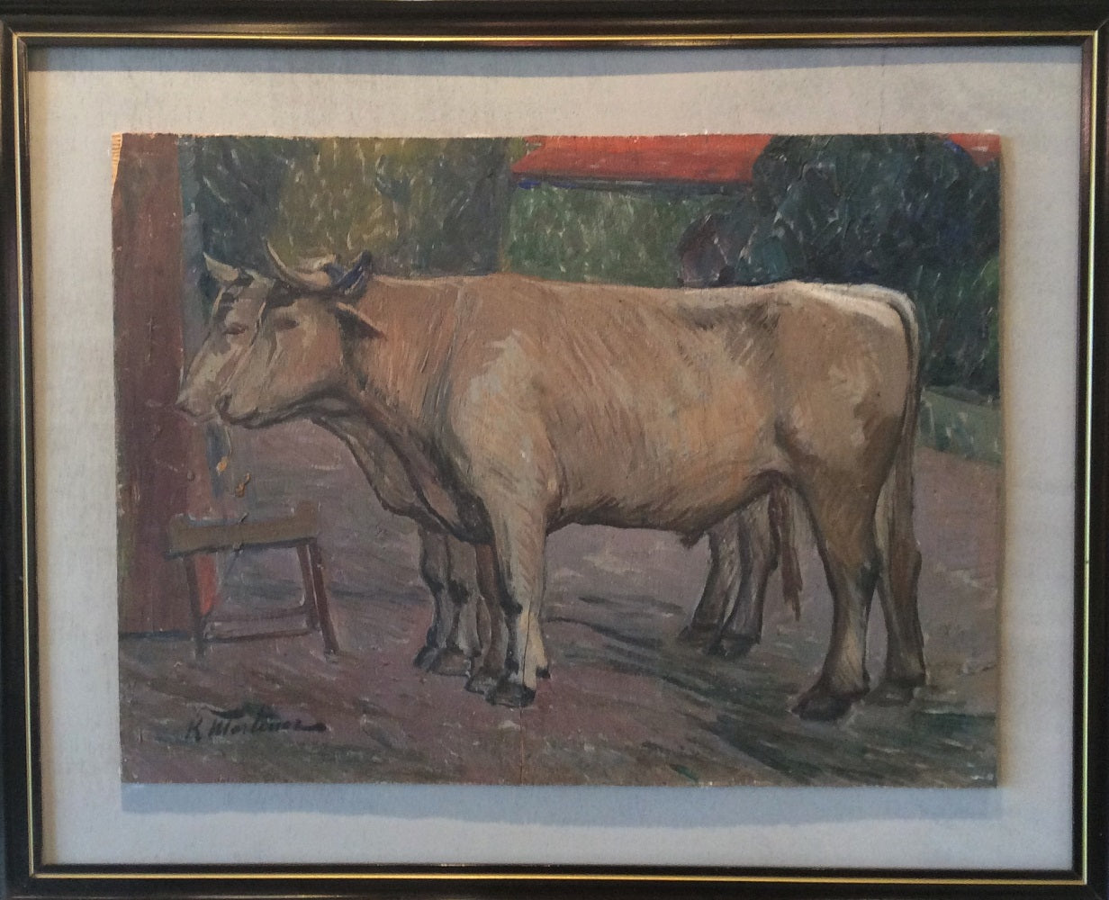 École Française 20e. Huile sur contreplaqué par Raymond Martinez (Oran (Algérie), 25 juin 1889 † Vichy, 25 mai 1969), Sbg. Panneau fendu au niveau de l'antérieur gauche du premier bœuf, manque dans le coin supérieur gauche. Provenance : Famille de l'artiste. 300*405 mm.