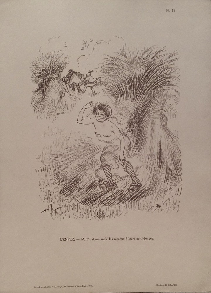 L'ENFER - Motif : Avoir mêlé les oiseaux à leurs confidences (1915) Lithographie dessinée par Henry Mirande (Nice, 26 mars 1877 † Paris, 20 septembre 1955). Pl. 12 des « Sourires de Paris », (Portfolio de 16 estampes, 1915, Librairie de l'Estampe, in-4). La Librairie de l'Estampe a été fondée dans les années 1910 par l’écrivain Charles Eugène Marius Antonin Arnaud dit Antonin Reschal (Pont-Saint-Esprit, 12 mai 1874 † Perpignan, 29 septembre 1935). Dim. : 377*275 mm.