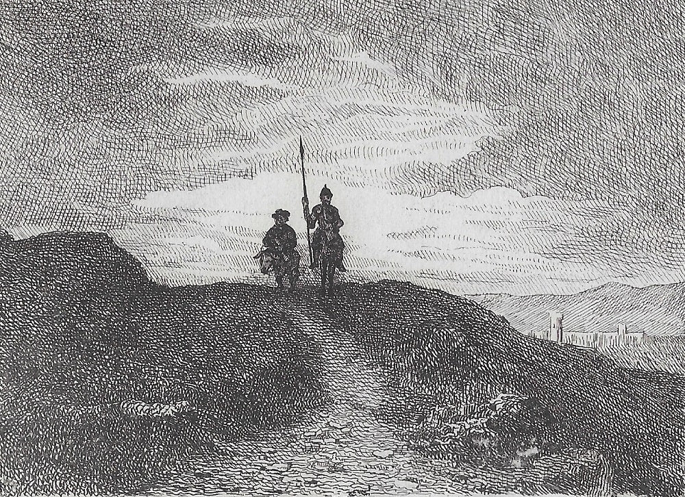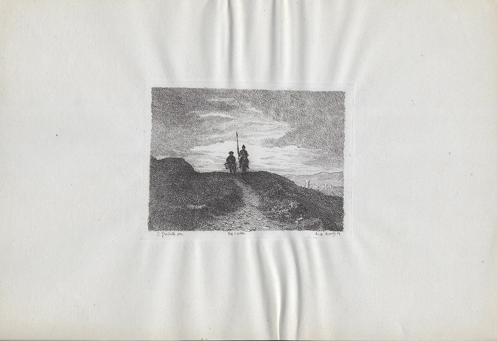 Planche par Marc Antoine Claude Monnin (Paris, 12 juin1806 † Ivry-sur-Seine, 25 mars 1884) d’après une peinture d’Eugène Claude Jandelle pour PARIS A L'EAU-FORTE, Journal, d'actualité, de curiosité et de fantaisie illustré d'eaux-fortes tirées par Charles Delâtre, 2ème année, n°59 du 21 mai 1874. Hommage à Miguel de Cervantes. Sur un chemin, quittant un cité fortifiée vue au loin et venant vers le spectateur, Don Quichotte, lance levée à la main, monté sur son vieux cheval Rossinante, accompagné à sa droite par son inséparable écuyer Sancho Panza. Vélin (197*288 mm) gondolé suite au collage de l’épreuve sur Chine (au TC 82*110 mm).