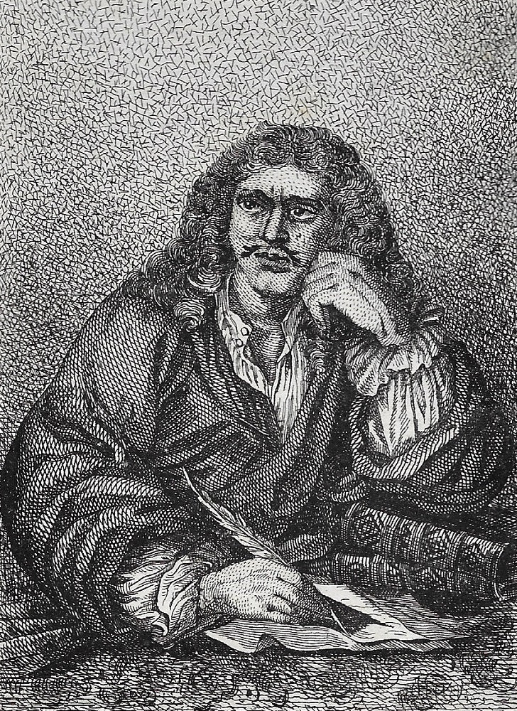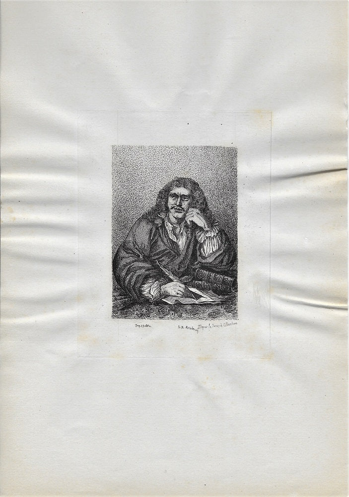 Planche par Marc Antoine Claude Monnin (Paris, 12 juin1806 † Ivry-sur-Seine, 25 mars 1884) d’après François Boucher (1703 † 1770) (Nota : c’est le portrait de Molière gravé par Lépicié d'après Coypel en frontispice des Œuvres de Molière, Paris, Imprimerie de P. Prault), 1734) pour PARIS A L'EAU-FORTE, Journal, d'actualité, de curiosité et de fantaisie illustré d'eaux-fortes tirées par Charles Delâtre, 2ème année, n°58 du 17 mai 1874. Vélin (288*200 mm) froissé suite collage de l’épreuve sur Chine (141*110 mm, au TC 99*72 mm).