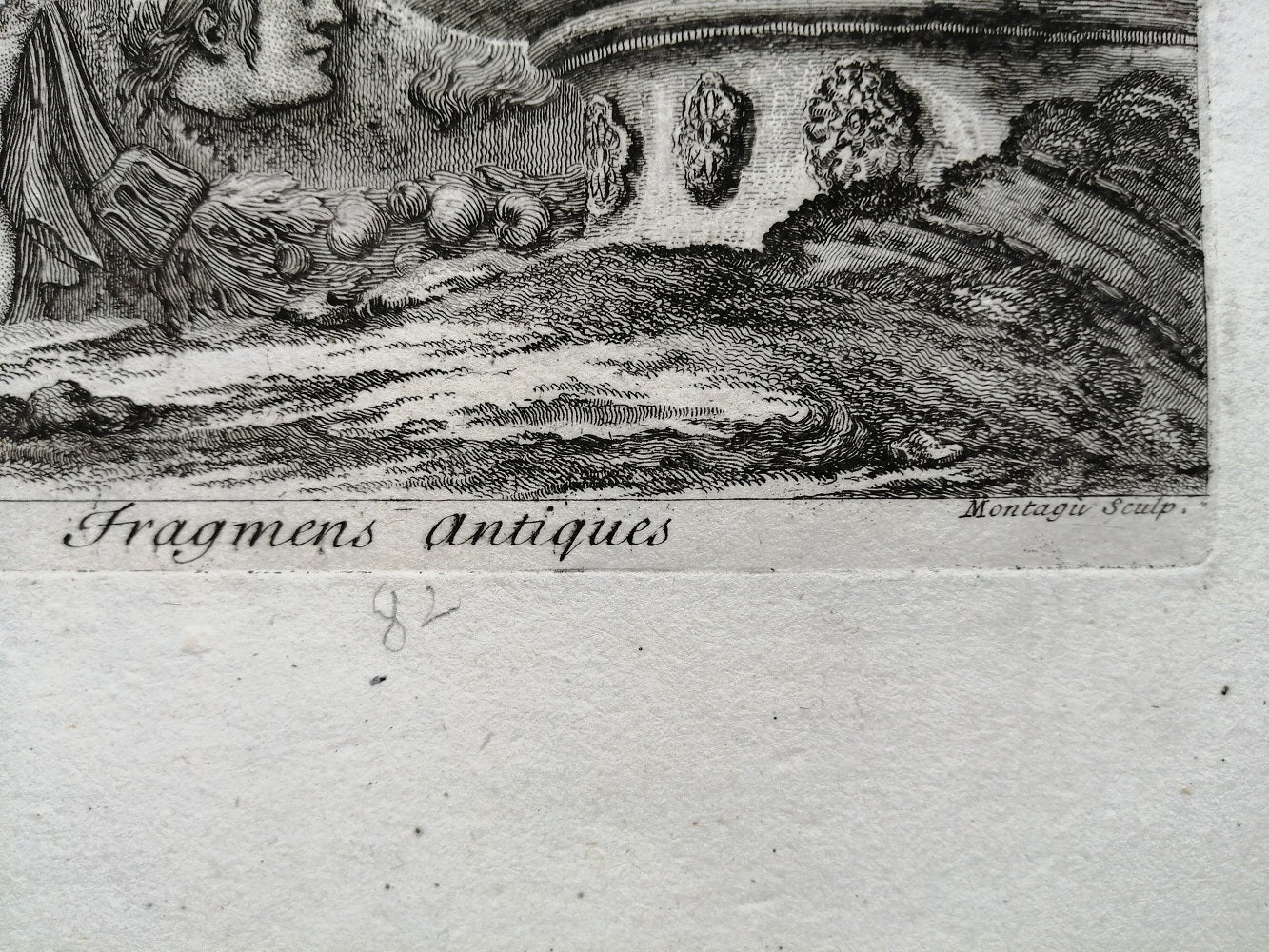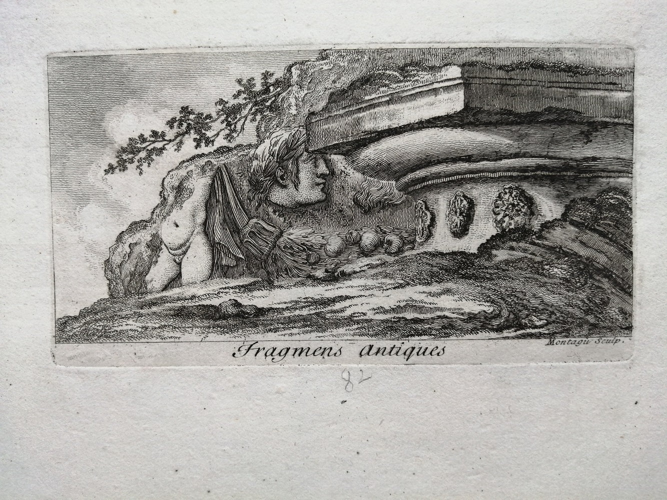 Estampe représentant, enfouis dans la glaise, la moitié d'une d'un corps d'homme dénudé, une tête d'homme de profil, un chapiteau dorique. Sous le TC Titrée au centre Fragmens antiques Sbd Montaigu Sculpt. Grandes marges Feuille 300*173 mm, au TC 82*165 mm, a CP 90*167 mm