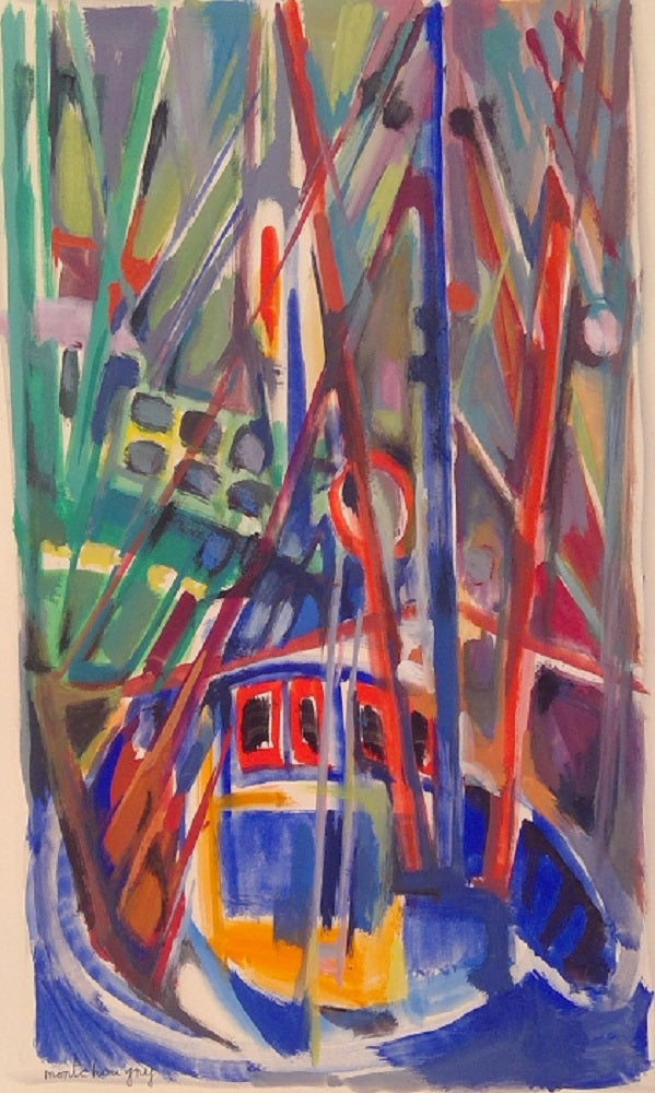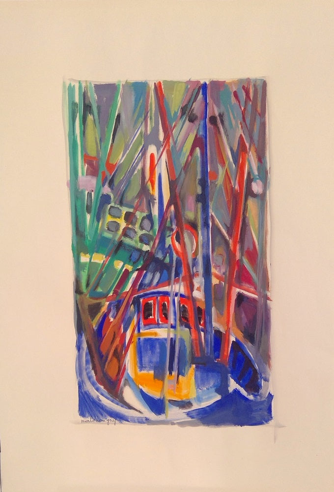 Peinture/Gouache sur papier vélin (620*434 mm) par Jean Montchougny (Nevers (Nièvre), 4 janvier 1915 † Chaulgnes (Nièvre), 18 mai 2008). Sbg en majuscules au crayon. Collé sur vélin. Au dos annotation à l’encre noire le thonier bleu | Août 1969 | H 42,5 x 25, le chiffre 650 dans un cercle et le cachet à l’encre bleue MONTCHOUGNY | PEINTRE | 58 – LA CHARITE-s/-LOIRE | Tél. 214. Sujet 425*250 mm.