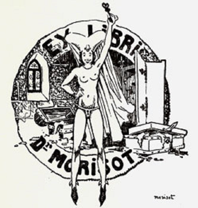 Ex Libris du médecin graveur belge Jean Morisot. Zincographie érotique représentant une femme dénudée sous une robe du moyen-âge brandissant la clef de sa ceinture de chasteté. Sbd dans la planche.