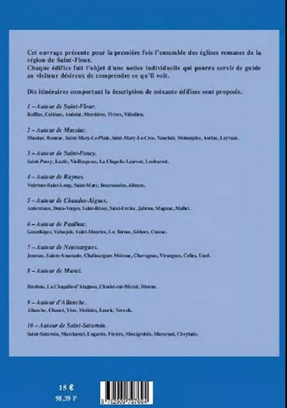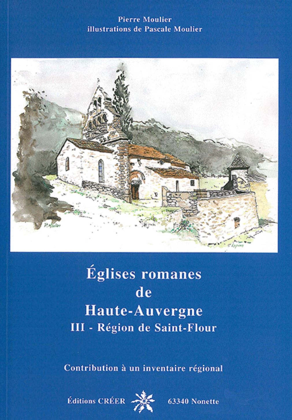 Éditions CRÉER. Texte de Pierre MOULIER. 172 dessins à la plume de Pascale MOULIER. Format : 16,5 x 24 cm, épaisseur 1 cm. 189 p. 57 Plans et coupes. Broché collé, couverture souple sans rabats. Poids: 469g. Depuis le début du XXème siècle aucun inventaire aussi complet n'avait été entrepris sur les églises du Cantal. Ne sont étudiées que les parties romanes des édifices. Le parti-pris retenu pour les trois ouvrages est celui de dessins. our la région de Saint-Flour, dix itinéraires comportant la description de soixante édifices sont proposés : 1 - Autour de Saint-Flour. - Roffiac. - Coltines. - Andelat. - Mentières. - Tiviers. - Villedieu. 2 - Autour de Massiac. - Massiac. - Bonnac. - Saint-Mary-le-Plain. - Saint-Mary-le-Cros. - Vauclair. - Molompize. - Auriac. - Leyvaux. 3 - Autour de Saint-Poncy. - Saint-Poncy. - Lastic. - Vieillespesse. - La Chapelle-Laurent. - Loubarcet. 4 - Autour de Ruynes. - Vedrines-Saint-Loup. - Saint-Marc. - Bournoncles. - Alleuze. 5 - Autour de Chaudes-Aigues. - Anterrieux. - Deux-Verges. - Saint-Rémy. - Saint-Urcize. - Jabrun. - Magnac. - Mallet. 6 - Autour de Paulhac. - Gourdièges. - Valuejols. - Saint-Maurice. - Les Ternes. - Sériers. - Cussac. 7 - Autour de Neussargues. - Joursac. - Sainte-Anastasie. - Chalinargues. - Moissac. - Chavagnac. - Virargues. - Celles. - Ussels. 8 - Autour de Murat. - Bredons. - La Chapelle d'Alagnon. - Chastel-sur-Murat. - Dienne. 9 - Autour d'Allanche. - Allanche. - Chanet. - Vèze. - Molèdes. - Laurie. - Vernols. 10 - Autour de Saint-Saturnin. Saint-Saturnin. - Marchastel. - Lugarde. - Féniers. - Montgreleix. - Marcenat. - Cheylade.