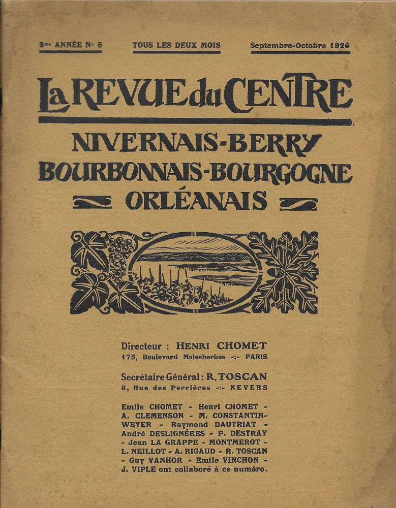 bois de Louis Neillot Nu pleine page, Paysage bourbonnais en cul-de-lampe, bois de Montmerot Morvan en cul-de-lampe Textes : Un témoin nivernais du romantisme Charles Devieur dit Robelin 1796-1857 par P. Destray, Noblesse de la Loire pour Henri Chomet par Maurice Constantin-Weyer, Principaux centres d'expérimentation créés par l'office régional agricole du Centre par Emile Chomet Bois de Louis Neillot "Paysage bourbonnais" en cul-de-lampe, Le mystère de Glozel par Joseph Viple, Le Gars Fanchou par Raymond Dautriat. bois de Montmerot "Morvan" en cul-de-lampe à la fin de la livraison. Poèmes de E. Vinchon 24*19 cm. Nivernais Berry Bourbonnais Bourgogne Orléanais 3ème année, N°5, septembre-octobre 1926. p. 131-160 |32p] T