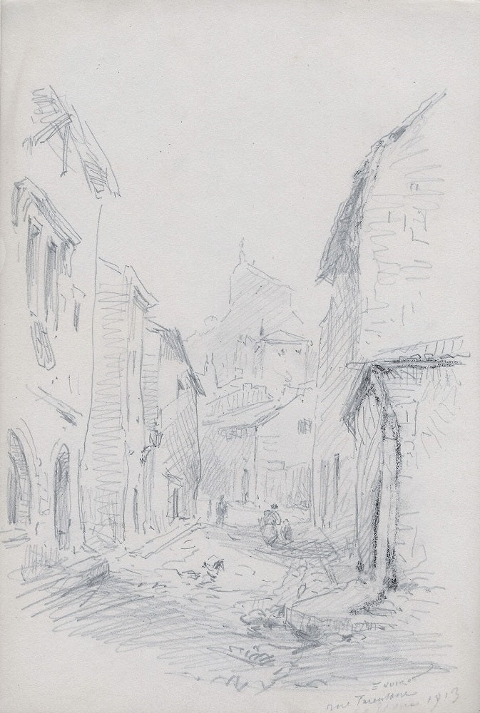 A01 Crayon par Émile Noirot (Roanne (Loire), 5 juin 1853 † St-Germain-des-Fossés (Allier), 5 juin 1924), 1er dessin du carnet A (feuille 175*259 mm), Signé, situé et daté en bd E NOIROT | rue Tarentaise | 1913. Format portrait. Titre partiellement forgé. Agréable paysage urbain animé, dans la rue bordée de bâtiments à l’architecture pittoresque, au premier plan des volailles, plus loin une mère et son enfant, au fond une silhouette d'homme ; en arrière-plan sur une élévation une chapelle esquissée.