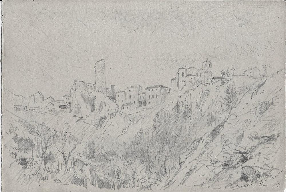 A02 Crayon par Émile Noirot (Roanne (Loire), 5 juin 1853 † St-Germain-des-Fossés (Allier), 5 juin 1924), Second dessin du carnet A (feuille 175*259 mm), Signé, situé et daté en bd E NOIROT | Rochetaillée mars 1913. Paysage. Cette ancienne commune de la Loire est rattachée à celle de Saint-Étienne depuis 1973. Au premier plan, un vallon boisé. En arrière-plan, à gauche les ruines du château féodal datant du XIIe dont on aperçoit que l’une des trois tours restantes, quelques maisons de part et d’autre des ruines, à droite l’église.