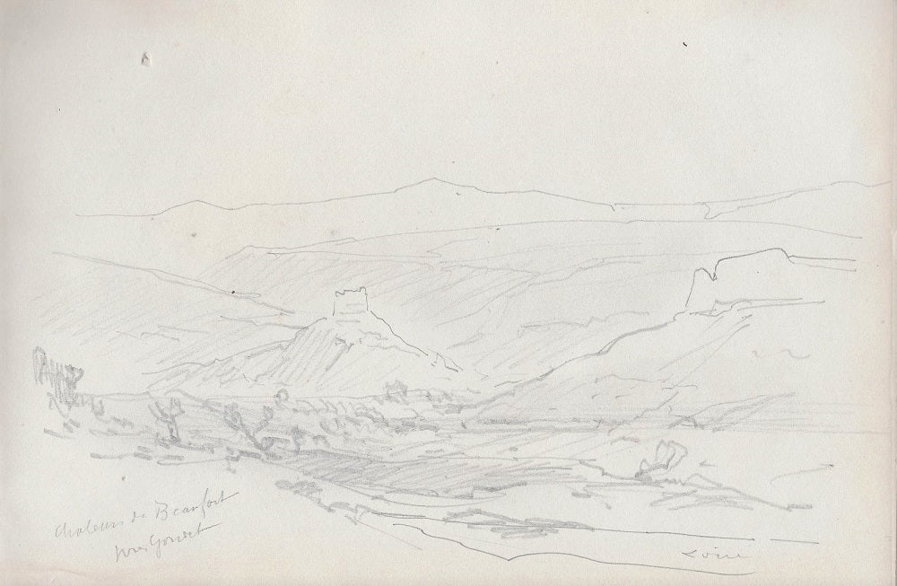 A07 Esquisse, crayon. 7ème dessin du carnet A (feuille 175*259 mm) par Émile Benoit Noirot (Roanne (Loire), 5 juin 1853 † St-Germain-des-Fossés (Allier), 5 juin 1924, NS, situé en bg Château de Beaufort | près Goudet. Format paysage. Vue sur les ruines du château de Beaufort édifié au début du XIIIe siècle sur un piton rocheux surplombant le bourg de Goudet dans la Haute-Loire et la vallée de la Loire. Comme le village précédent, Goudet a été visité par Stevenson.