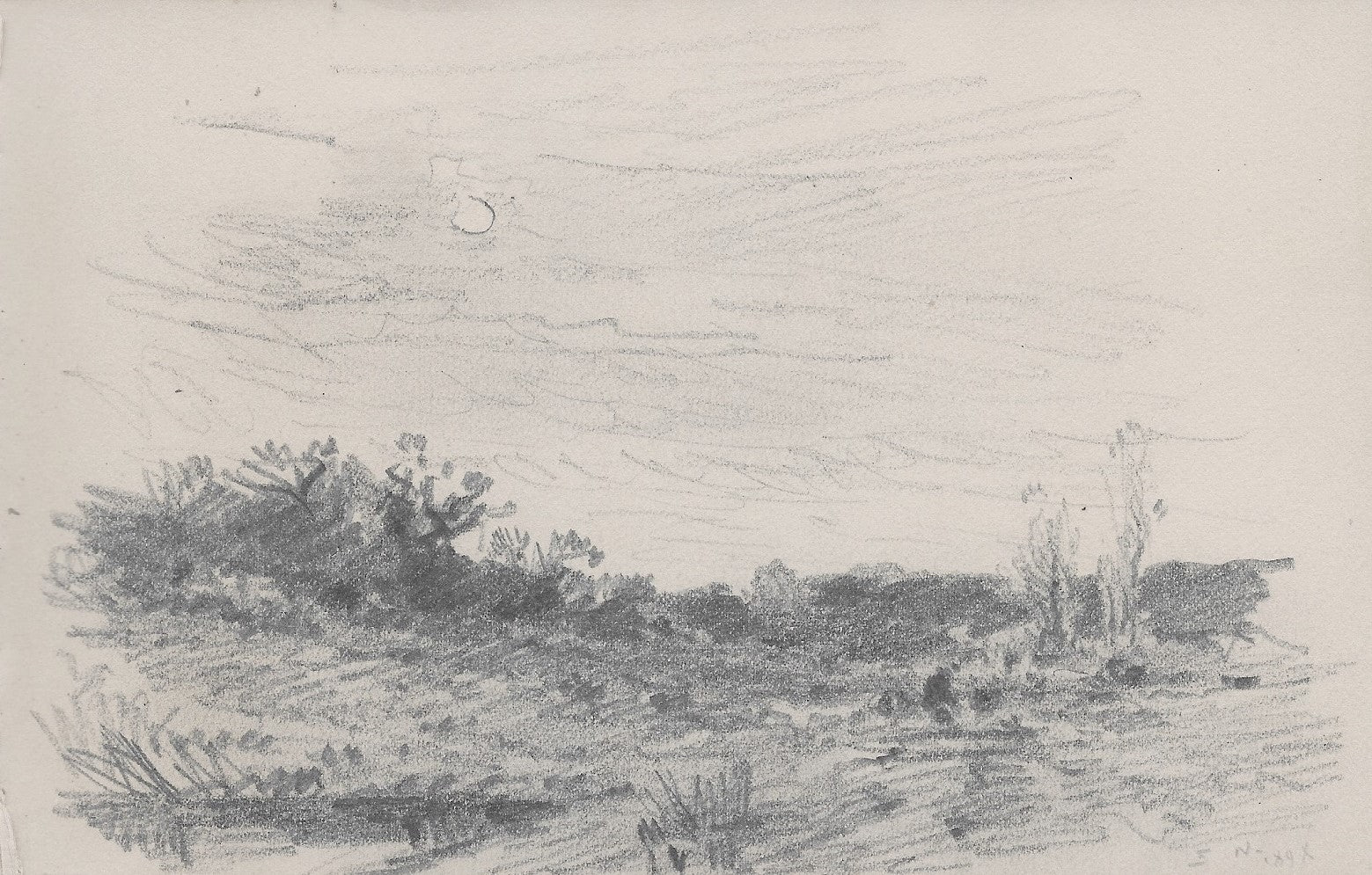D100 Crayon par Émile Noirot (Roanne (Loire), 5 juin 1853 † St-Germain-des-Fossés (Allier), 5 juin 1924), 10ème dessin du carnet D (feuille 117*183 mm), Monogrammé, daté en bd E. N. | 1898. Dans un vallon, au premier plan à gauche une mare, un peu plus loin sur la droite on devine une bergère assise et ses moutons devant deux peupliers. Sur la gauche, légèrement en hauteur, des taillis et arbustes. Dans le ciel, une lune bien ronde.