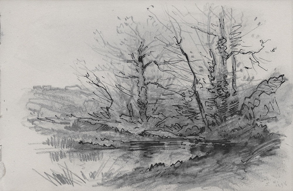 D103 Encre et crayon par Émile Noirot (Roanne (Loire), 5 juin 1853 † St-Germain-des-Fossés (Allier), 5 juin 1924), 12ème dessin du carnet D (feuille 117*183 mm), Monogrammé, daté en bd E N. | 1898. Titre forgé. Probable paysage de la campagne roannaise reprenant lzs sujets favoris du dessinateur : une mare bordée par un chemin, à l’arrière des arbres effeuillés, à l’arrière-plan sur la gauche la toiture d’une bâtisse sur la colline.