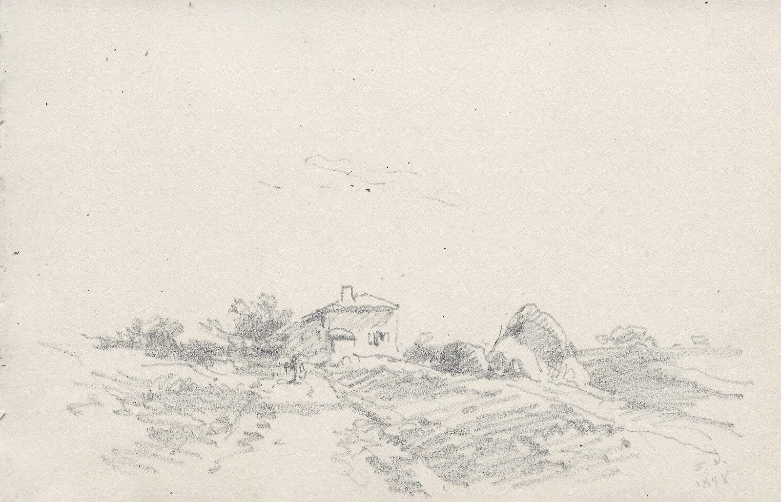 D105 Crayon par Émile Noirot (Roanne (Loire), 5 juin 1853 † St-Germain-des-Fossés (Allier), 5 juin 1924) Monogrammé, daté en bd E N. | 1898. 15ème dessin du carnet D (feuille 117*183 mm). Titre forgé. Probable paysage de la campagne roannaise. Paysage animée. Vue rapprochée du sujet précédent avec un personnage sur le chemin près de la ferme.