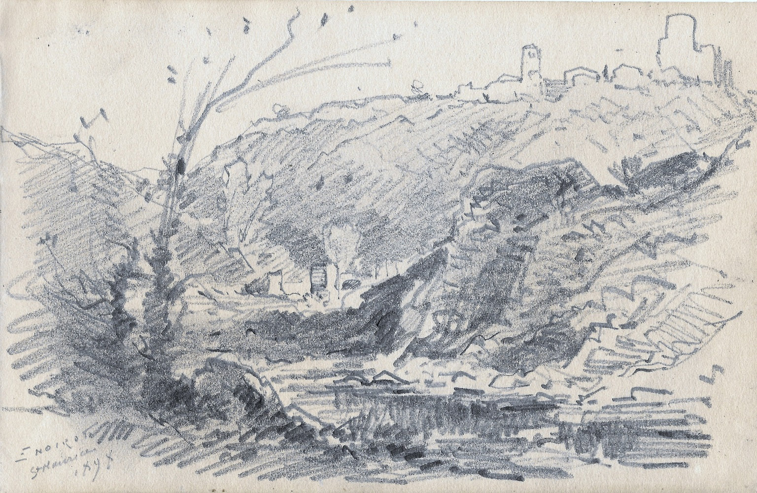 D108 Crayon par Émile Noirot (Roanne (Loire), 5 juin 1853 † St-Germain-des-Fossés (Allier), 5 juin 1924), 18ème dessin du carnet D (feuille 117*183 mm), Signé, daté en bg E NOIROT | St Maurice | 1898. Paysage de la Loire. Au premier plan une étendue d’eau avec, à gauche une rive herbacée avec deux arbustes et un rocher, à droite l’autre rive rocheuse et pentue, en arrière-plan des bâtiments, dans le fond, deux collines avec sur celle de droite l’esquisse des maisons, de l’église et du château de Saint-Maurice.