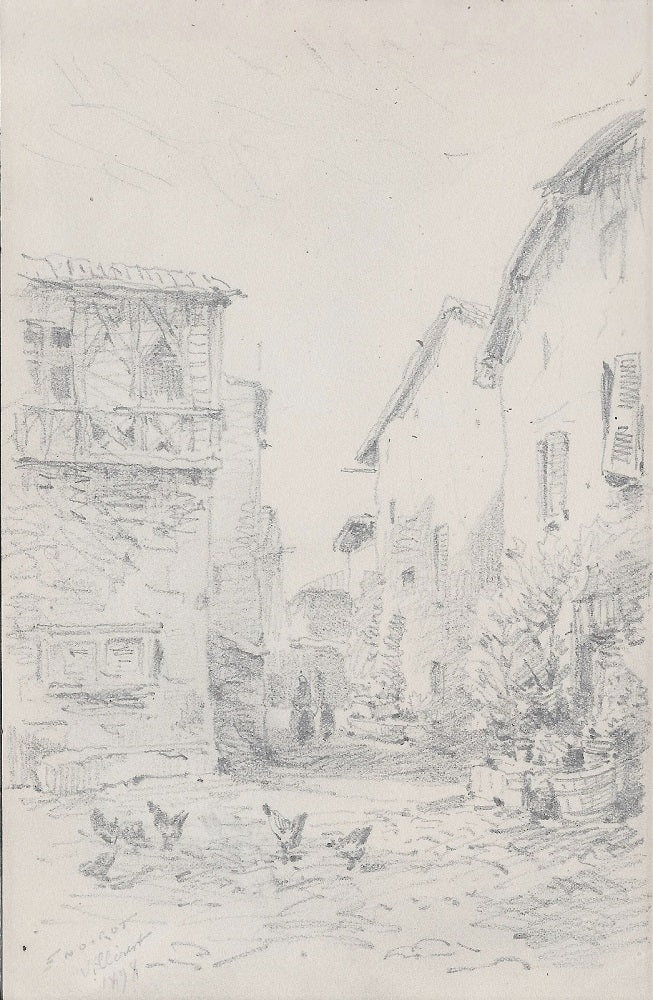 D109 Crayon par Émile Noirot (Roanne (Loire), 5 juin 1853 † St-Germain-des-Fossés (Allier), 5 juin 1924), 18ème dessin du carnet D (feuille 117*183 mm), Signé, situé et daté en bg E NOIROT | Villerest | 1898. Titre partiellement forgé. Format portrait. Des poules picorent dans une ruelle de ce bourg de la campagne roannaise, à gauche un ne maison en pierre avec un balcon en bois, sur le mur, un placard d’affiches officielles, à droite quelques arbustes dans des barriques au pied d’une maison à étage, au centre la rue se prolongent bordées de maison et parcourue par deux silhouettes.