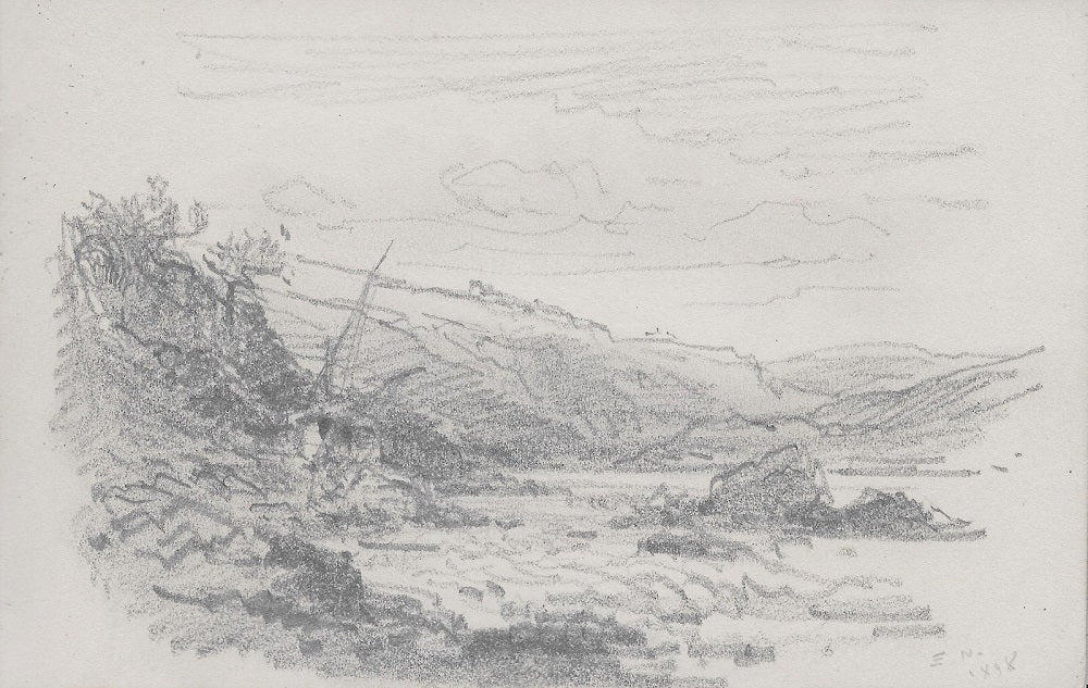 D112 Crayon par Émile Noirot (Roanne (Loire), 5 juin 1853 † St-Germain-des-Fossés (Allier), 5 juin 1924), 21ème dessin du carnet D (feuille 117*183 mm), Monogrammé, daté en bd E N. | 1898. Titre forgé. Dans une vallée coule le fleuve contournant un rocher, sur le bord gauche on devine un carrelet de pêcheur au pied d’une falaise avec quelques arbres, en arrière-plan sur une montagne esquissée quelques maisons groupées (St Maurice ?).