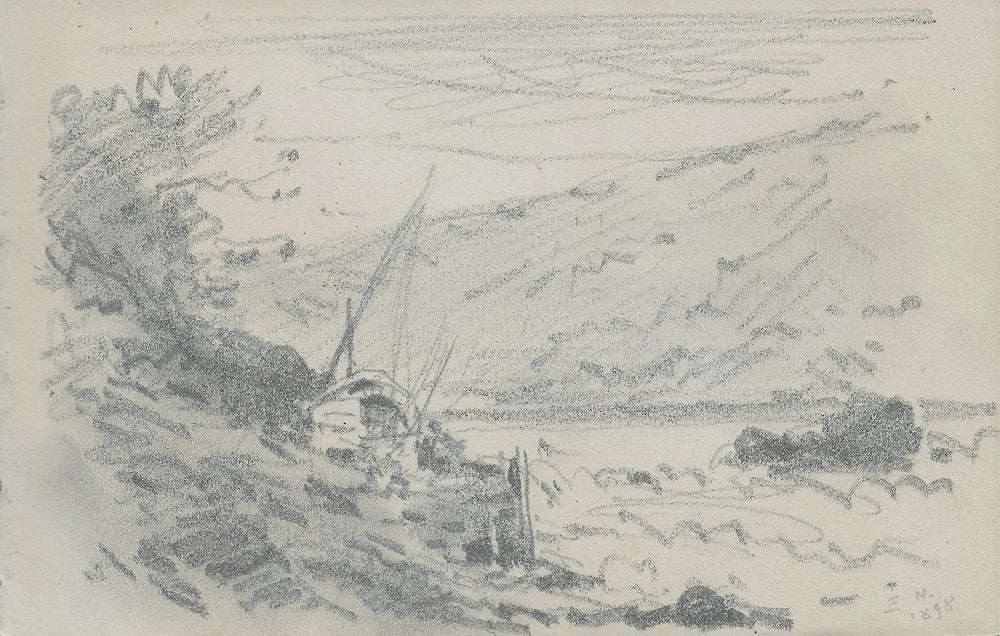 D113 Crayon par Émile Noirot (Roanne (Loire), 5 juin 1853 † St-Germain-des-Fossés (Allier), 5 juin 1924), 22ème dessin du carnet D (feuille 117*183 mm), Monogrammé, daté en bd E N. | 1898. Titre forgé. (St Maurice ?). Vue rapprochée de la précédente. Dans une vallée coule le fleuve contournant un rocher, sur la berge gauche montante, un arbre, en dessous un pêcheur auprès de son carrelet. En arrière-plan l’autre rive.