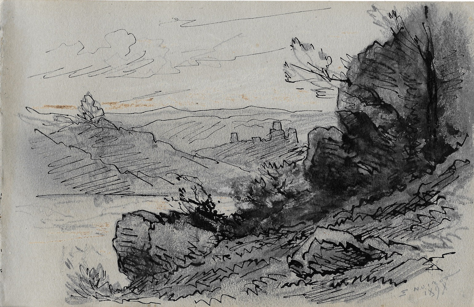 D114 Crayon par Émile Noirot (Roanne (Loire), 5 juin 1853 † St-Germain-des-Fossés (Allier), 5 juin 1924), 24ème dessin du carnet D (feuille 117*183 mm), Monogrammé, daté en bd E NOIROT | 1898 . Titre forgé. Autre paysage du roannais. Derrière la berge avec deux rochers et des taillis, la Loire, en arrière-plan, à gauche l’autre rive et sur la droite esquisse du village de St Maurice avec son clocher et son château ; dans le fond deux lignes de chaînes montagneuses. Rehauts de crayon de couleur bistre sur les chaines et dans le fleuve.