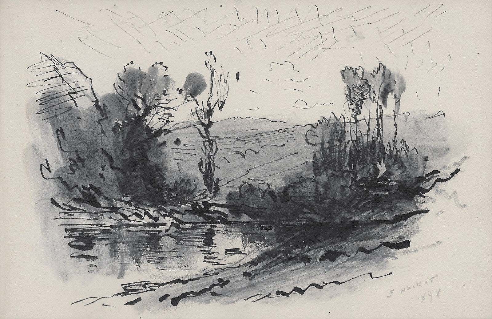 D118 Crayon et encre par Émile Noirot (Roanne (Loire), 5 juin 1853 † St-Germain-des-Fossés (Allier), 5 juin 1924), 28ème dessin du carnet D (feuille 117*183 mm), Signé, daté en bd E. Noirot | 1898 . Titre forgé. Autre paysage sauvage du roannais (Saint-Maurice ou Villerest ?), un cours d’eau entre deux bosquets, en arrière-plan des monts.