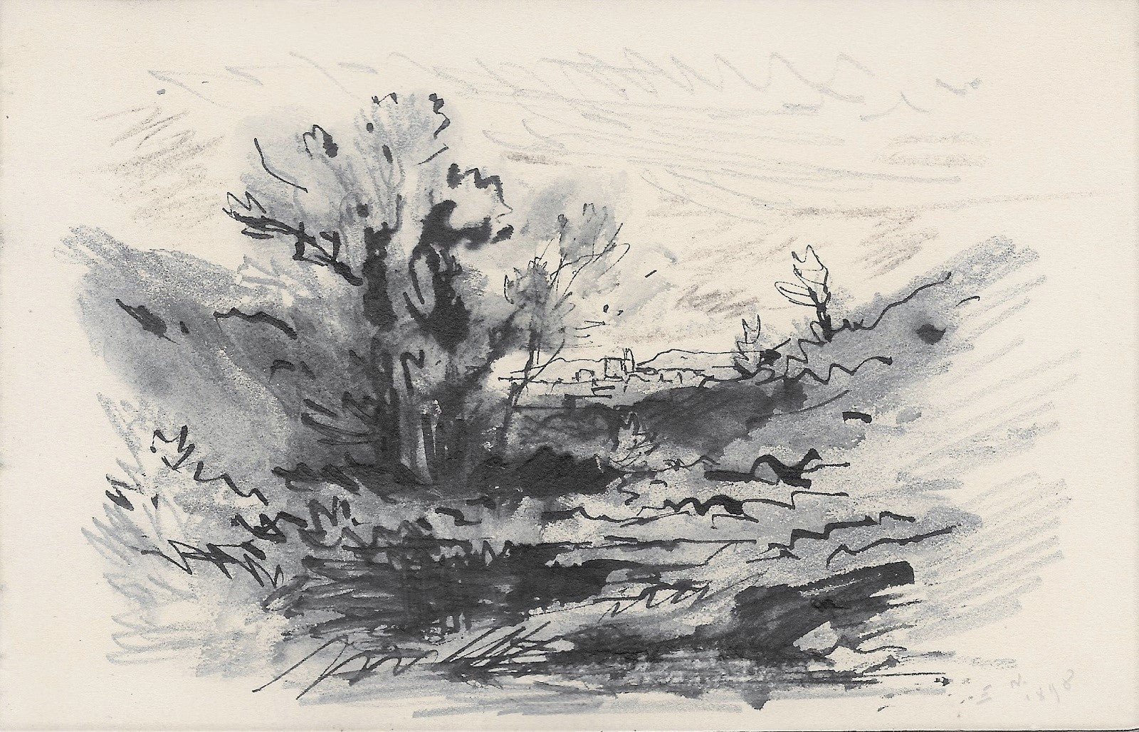 D120 Crayon, encre et rehauts par Émile Noirot (Roanne (Loire), 5 juin 1853 † St-Germain-des-Fossés (Allier), 5 juin 1924), Signé, daté en bd E. Noirot | 1898 . Titre forgé. 30ème dessin du carnet D (feuille 117*183 mm) . Titre forgé. Autre paysage sauvage du roannais (Saint-Maurice ou Villerest ?). Au premier plan, dans un vallon une mare devant quelques arbres, en arrière-plan esquisses des habitations d'un village.