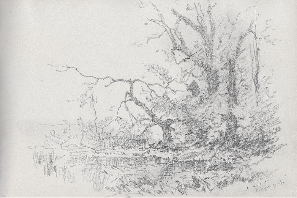 A18 Crayon par Émile Benoit Noirot (Roanne (Loire), 5 juin 1853 † St-Germain-des-Fossés (Allier), 5 juin 1924), 18ème dessin du carnet A (feuille 175*259 mm), Signé, situé et daté en bd E NOIROT | Bourzat 1917. Titre partiellement forgé. Paysage animé pris dans les environs de la propriété du peintre reprenant ses thèmes favoris : une mare au premier plan, arbres et des taillis derrière, et au centre, assise à gauche du premier arbre, une paysanne et sa chèvre.