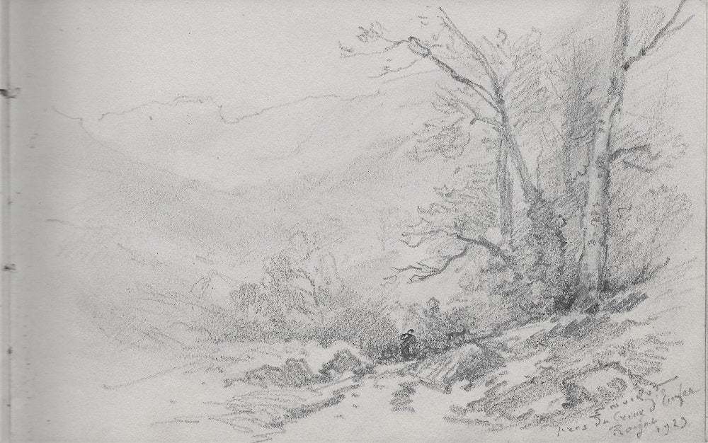B20 Dessin au crayon (feuille 130*204 mm)par Émile Benoit Noirot (Roanne (Loire), 5 juin 1853 † St-Germain-des-Fossés (Allier), 5 juin 1924, Signé, situé et daté en bd. Au premier plan un chemin nous amène vers une gardeuse de chèvre avec au fond un bosquet et à droite des arbres. En arrière-plan des montagnes esquissées. Dessin extrait du carnet B/ (n°19-56). En savoir plus.