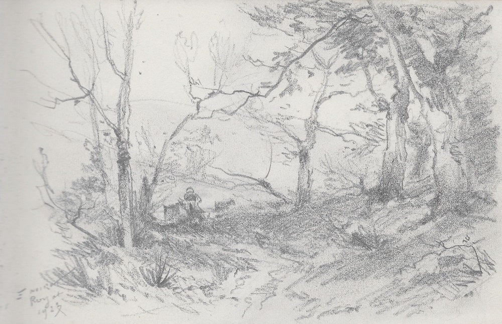 B23 Dessin au crayon (feuille 130*204 mm) par Émile Benoit Noirot (Roanne (Loire), 5 juin 1853 † St-Germain-des-Fossés (Allier), 5 juin 1924), 5ème dessin du carnet B, Signé, situé et daté en bg E. NOIROT | Royat | 1923. Titre partiellement forgé. Paysage animé des environs de Royat (Puy-de-Dôme). Au premier plan, un chemin descendant contournant à gauche un groupe d’arbres aux branches dénudés, à droite un rocher et six arbres dont certains encore feuillus ; au bout du chemin, de dos, une paysanne menant sa chèvre, dans le fond au bas de la vallée esquisse d’un bâtiment.