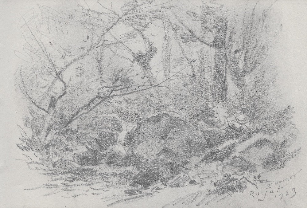 B25 Dessin au crayon (feuille 130*204 mm) par Émile Benoit Noirot (Roanne (Loire), 5 juin 1853 † St-Germain-des-Fossés (Allier), 5 juin 1924), Crayon, 7ème dessin du carnet B, Signé, situé et daté en bd E. NOIROT | Royat | 1923. Titre partiellement forgé. Paysage des environs de Royat (Puy-de-Dôme) représentant une cascade sur la Tiretaine au milieu d’arbres et arbustes partiellement effeuillés, au premier plan un gros rocher sur le bord gauche du ruisseau