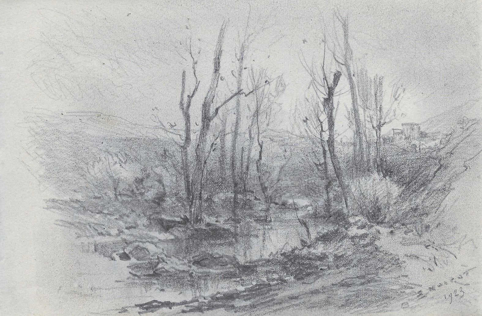 B27 Dessin au crayon par Émile Benoit Noirot (Roanne (Loire), 5 juin 1853 † St-Germain-des-Fossés (Allier), 5 juin 1924), SDbd E. NOIROT | 1923. 9ème dessin du carnet B (feuille 130*204 mm). Vue prise dans les environs de Royat dont on aperçoit, dans le fond à droite, le clocher de l’église. Au premier plan, au fond d’un vallon, un ruisseau barré par des rochers et souches, bordé d’arbres, un chemin à droite.