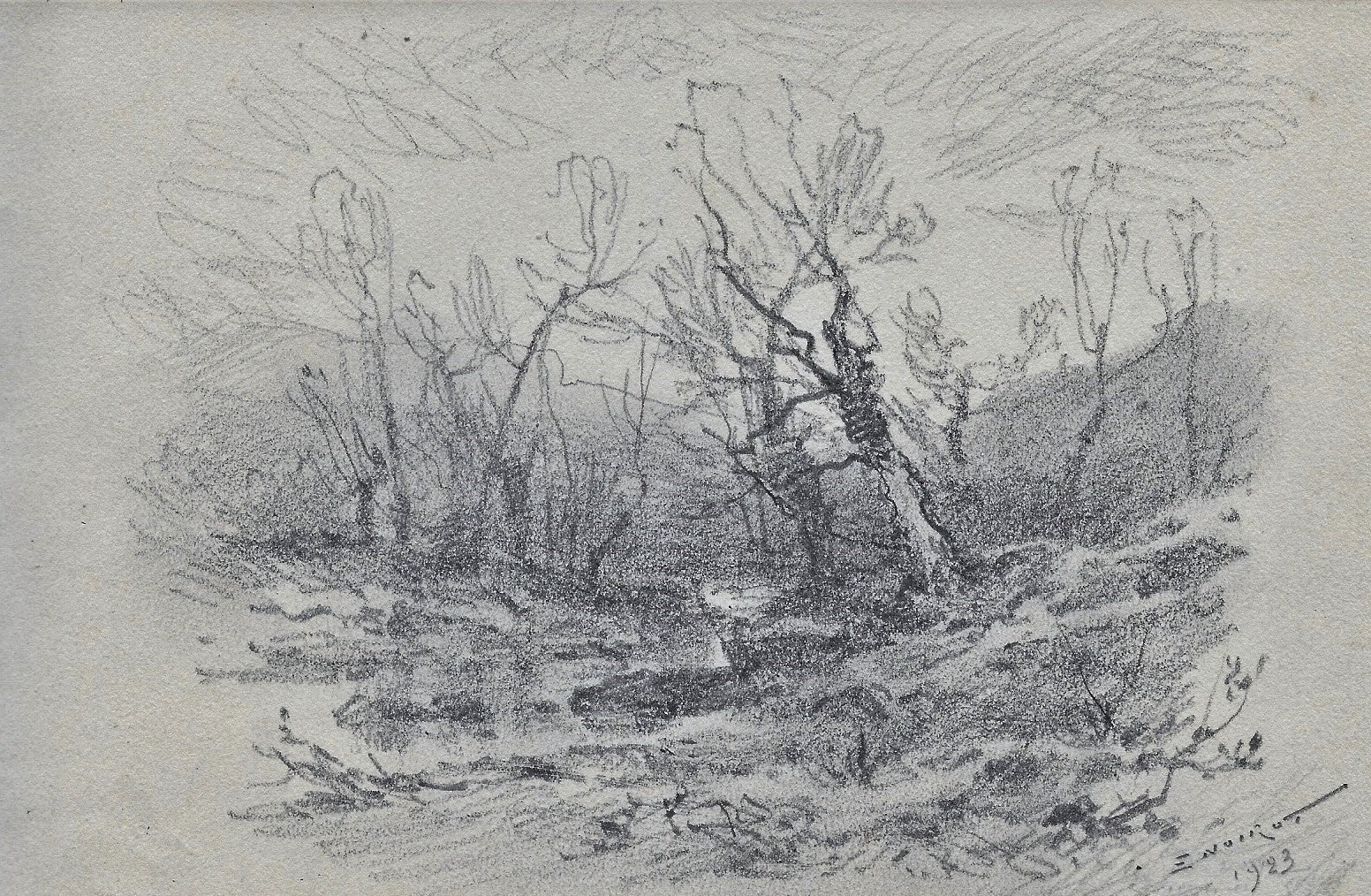 B28 Dessin au crayon par Émile Benoit Noirot (Roanne (Loire), 5 juin 1853 † St-Germain-des-Fossés (Allier), 5 juin 1924), Sbd E. NOIROT | 1923. 10ème dessin du carnet B (feuille 130*204 mm). Vue probablement prise dans les environs de Royat (Puy-de-Dôme) comme les dessins précédant. Dans un val, un ruisseau bordé d’arbustes effeuillés, au fond, esquisse des (Puys ?).
