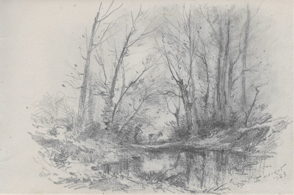 B30 Dessin au crayon (feuille 130*204 mm) par Émile Benoit Noirot (Roanne (Loire), 5 juin 1853 † St-Germain-des-Fossés (Allier), 5 juin 1924), 12ème dessin du carnet B (feuille 130*204 mm) contenant des vues prises dans les environs de Royat ou Clermont-Ferrand, SDbd E. NOIROT | 1923. Titre forgé. Probablement une vue prise en Auvergne, voire en Bourbonnais près de Saint-Germain des Fossés dans l’Allier où résidait l’artiste. Paysage animé rustique. Au premier plan au centre une petite mare, derrière des arbres défeuillés formant une voute sur un chemin où se trouve une paysanne de profil avec une chèvre.