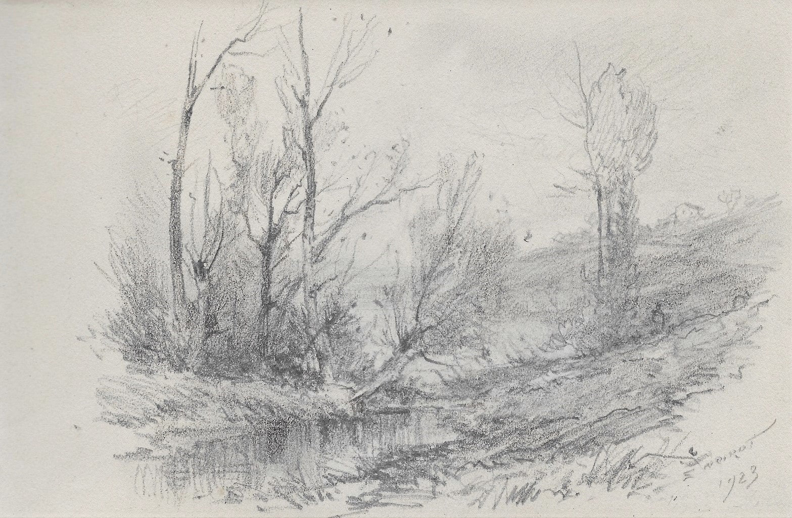 B31 Dessin au crayon par Émile Benoit Noirot (Roanne (Loire), 5 juin 1853 † St-Germain-des-Fossés (Allier), 5 juin 1924), Sbd E. NOIROT | 1923. 13ème dessin du carnet B (feuille 130*204 mm). Titre forgé. Vue probablement prise dans le Bourbonnais près de Saint-Germain-des-Fossés. Un ruisseau bordé à gauche par des taillis, six arbustes et un saule pleureur. Plus loin sur la rive droite un peuplier au pied duquel on devine un personnage (pêcheur ?). En arrière-plan, sur la droite à flanc de côteau une ferme.