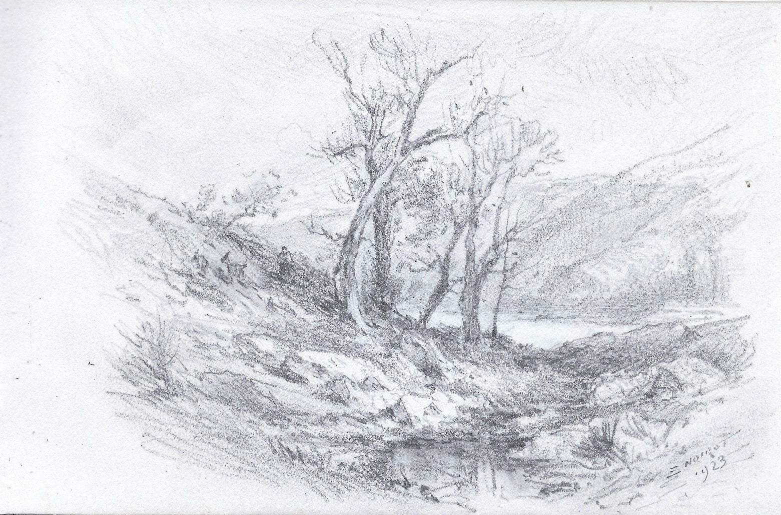B36 Dessin au crayon par Émile Benoit Noirot (Roanne (Loire), 5 juin 1853 † St-Germain-des-Fossés (Allier), 5 juin 1924), Sbd E. NOIROT | 1923. 18ème dessin du carnet B (feuille 130*204 mm). Titre forgé. Vue probablement prise en Auvergne dans les environs de Royat. Au premier plan un trou d’eau au pied, à gauche d’une pente escarpée gravie par une chèvre suivie de la bergère ayant dépassé un groupe de cinq arbres effeuillés. Derrière on aperçoit le cours d’eau et l’autre berge à flanc de côteau. Une bande de terre et rochers sépare la pièce d’eau de la rivière.