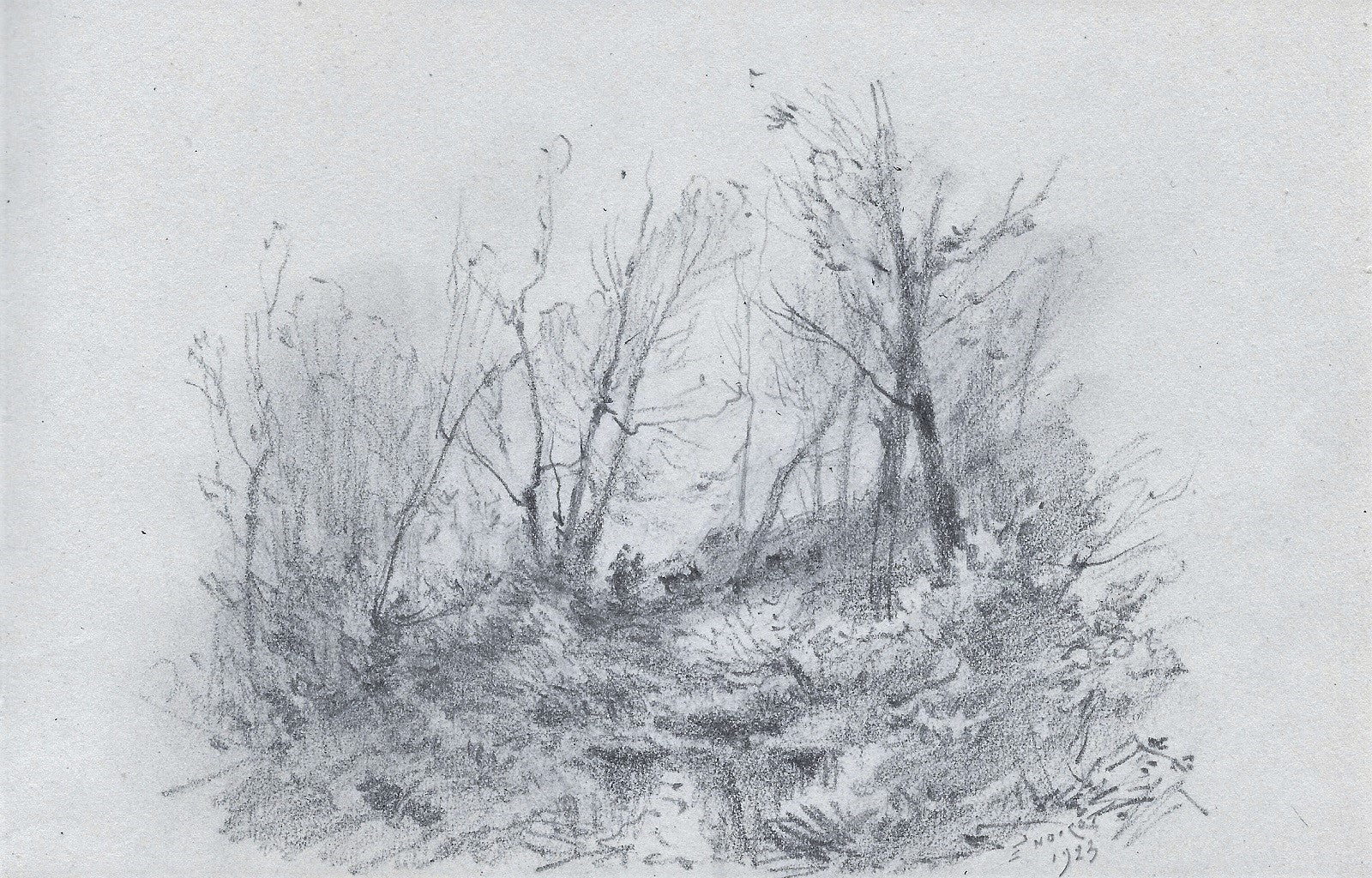 B39 Dessin au crayon par Émile Benoit Noirot (Roanne (Loire), 5 juin 1853 † St-Germain-des-Fossés (Allier), 5 juin 1924), Sbd E. NOIROT | 1923. 21ème dessin du carnet B (feuille 130*204 mm). Titre forgé. Vue probablement prise en Auvergne dans les environs de Royat. Autre composition en diagonale pour cette scène champêtre. Au-milieu d’un sous-bois, sur une pente montant de gauche à droite, une paysanne et sa chèvre.