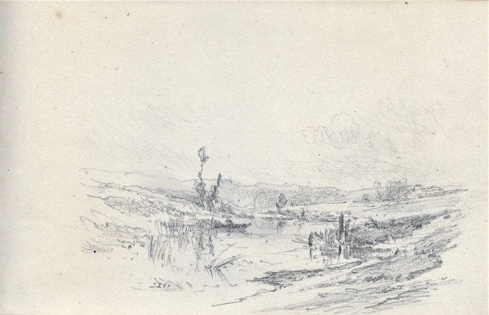 B47 Dessin au crayon par Émile Benoit Noirot (Roanne (Loire), 5 juin 1853 † St-Germain-des-Fossés (Allier), 5 juin 1924), SDbd E. NOIROT | 1923. NS. 29ème dessin du carnet B (feuille 130*204 mm) avec le sujet sur la moitié inférieure de la page. Titre forgé. Vue probablement prise en Auvergne aux environs de Royat, ou en Bourbonnais près de Saint-Germain-des-Fossés. Un plan d’eau dans le creux d’une prairie avec quelques arbres disséminés et dans le fond, à droite, une ferme. Au premier plan, à droite, esquisse d’un chemin montant à gauche de ce qui pourrait-être le ruisseau alimentant la nappe sur laquelle on devine un homme dans une barque près de la berge. Tâche en hg.