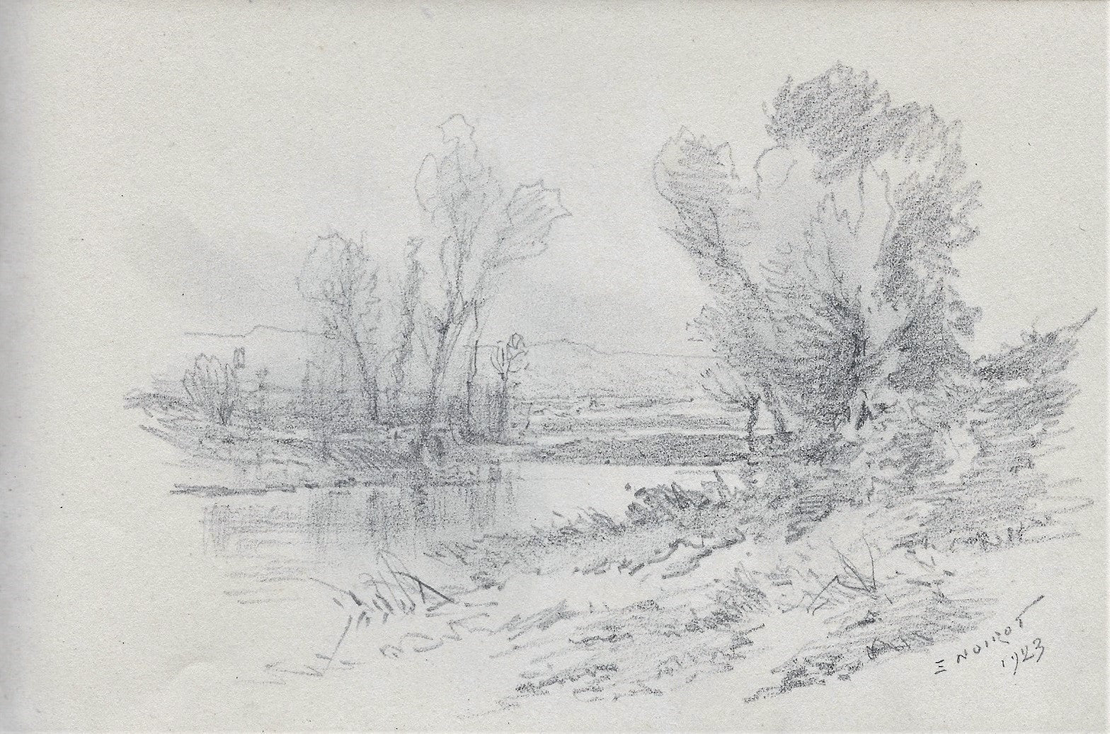 B49 Dessin au crayon par Émile Benoit Noirot (Roanne (Loire), 5 juin 1853 † St-Germain-des-Fossés (Allier), 5 juin 1924), SDbd E. NOIROT | 1923. Vue probablement prise en Bourbonnais près de Saint-Germain-des-Fossés (Allier). Titre forgé. Au premier plan le bord d’un cours d’eau en pente herbacée avec un bosquet de quatre feuillus dans le virage de la rivière tournant à gauche sous un pont entouré de six arbres. En arrière-plan une chaîne de collines esquissée.