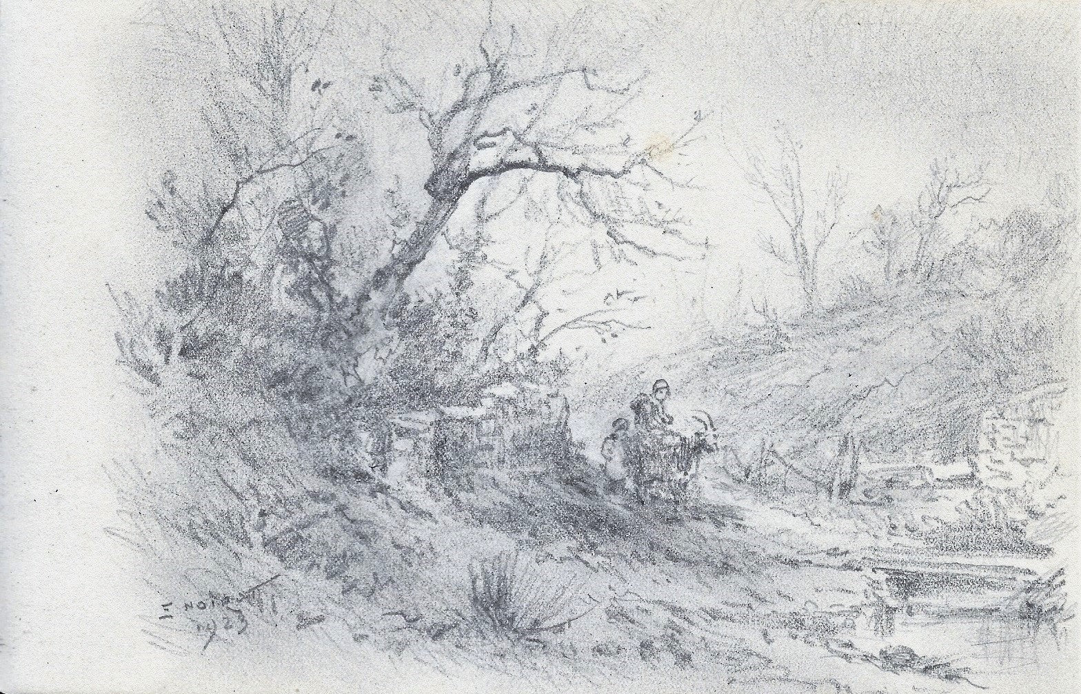 B50 Dessin au crayon par Émile Benoit Noirot (Roanne (Loire), 5 juin 1853 † St-Germain-des-Fossés (Allier), 5 juin 1924), SDbg E. NOIROT | 1923. 32ème dessin du carnet B (feuille 130*204 mm). Titre forgé. Paysage animé probablement pris en Auvergne aux environs de Royat. À droite un cours d’eau, derrière sur la rive pentue les ruines d’un mur au milieu de la végétation ; sur la crête de la pente, en arrière-plan, quatre arbustes effeuillés en ligne. Au premier plan, la rive gauche en pente herbacée descendante avec des taillis, feuillus et un pan de mur devant lequel se tiennent debout un enfant, une jeune paysanne et une chèvre au bord du petit chemin longeant la berge. Tâche en haut au milieu des branches.