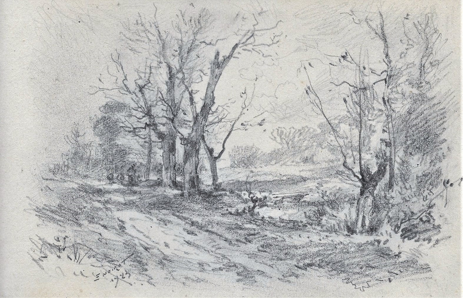 B55 Dessin au crayon par Émile Benoit Noirot (Roanne (Loire), 5 juin 1853 † St-Germain-des-Fossés (Allier), 5 juin 1924), SDbg E. NOIROT | 1923. 37ème dessin du carnet B (feuille 130*204 mm). Titre forgé. Paysage animée. Un chemin de terre bordé à gauche par un terrain en pente et à droite par un cours d’eau. À droite sur la berge un premier groupe de taillis et trois arbres effeuillés, ensuite un espace permettant de voir une passerelle en bois sur le ruisseau avec en arrière-plan un sous-bois esquissé, puis une ligne de quatre arbres effeuillés près desquels, sur le chemin, une paysanne et deux chèvres avec en arrière-plan d’autres arbres. Compte-tenu du dessin précédent le paysage pourrait être situé près de Vichy entre Le Boutiron et le moulin Tacot à Rhue