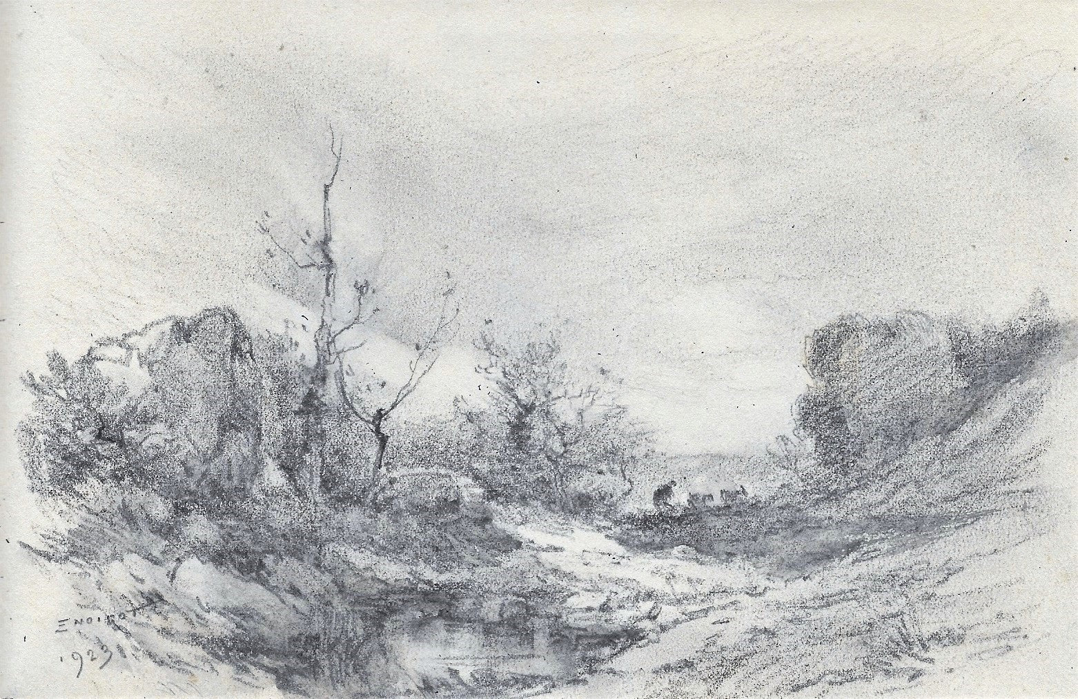 B56 Dessin au crayon par Émile Benoit Noirot (Roanne (Loire), 5 juin 1853 † St-Germain-des-Fossés (Allier), 5 juin 1924), SDbg E. NOIROT | 1923. 38ème et dernier dessin du carnet B (feuille 130*204 mm). Titre forgé. Paysage animée. Au premier plan, un point d’eau entouré à gauche par des pierres, rochers et trois arbrisseaux effeuillés, derrière un chemin de pierre passe à droite d’un taillis et à gauche de ce qui semble être une mare desséchée derrière laquelle se tiennent une paysanne courbée et deux chèvres au pied d’une pente boisée. En arrière-plan le ciel. Compte-tenu du dessin précédent le paysage pourrait être situé près de Vichy entre Le Boutiron et le moulin Tacot à Rhue