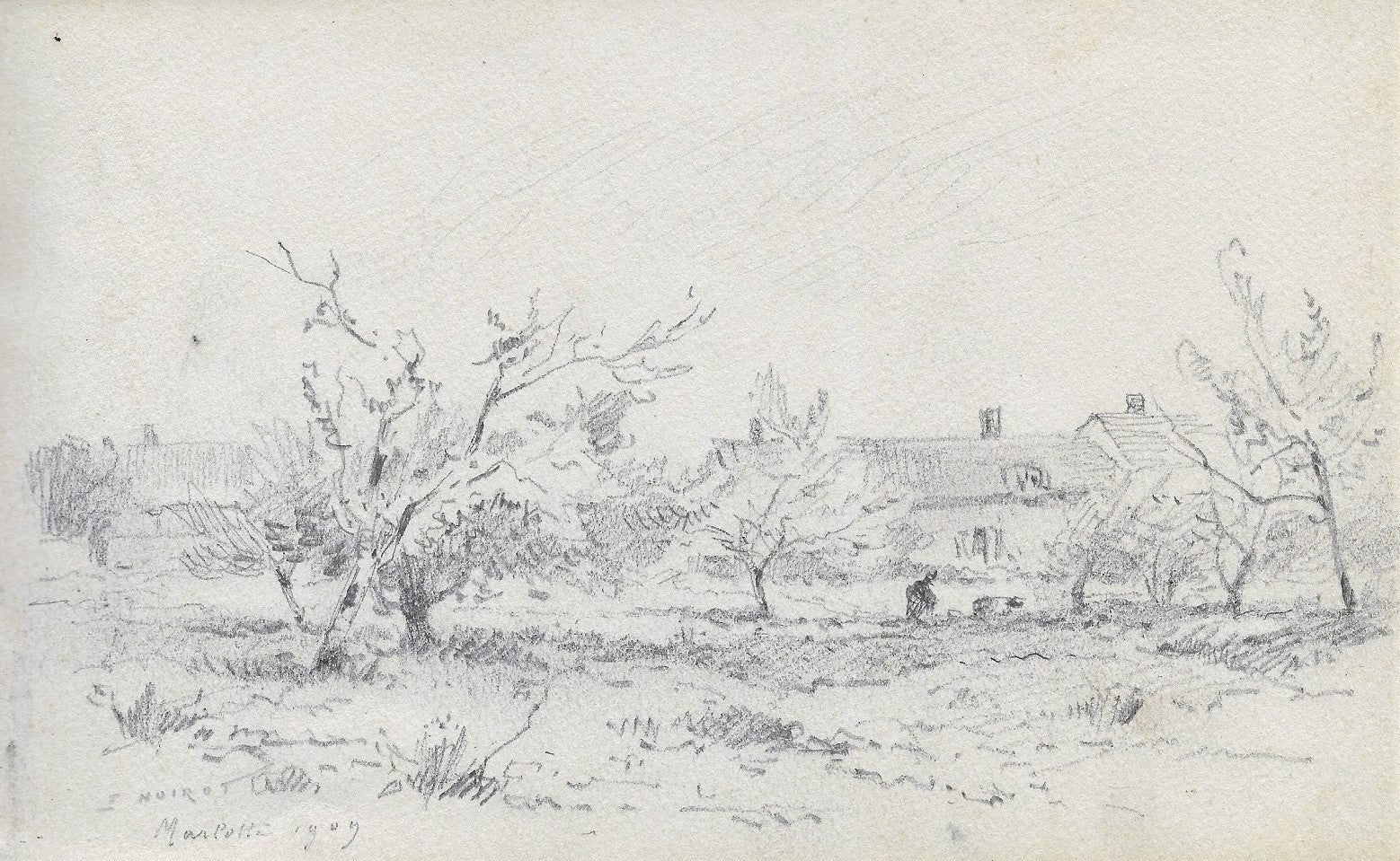 C60 Crayon par Émile Noirot (Roanne (Loire), 5 juin 1853 † St-Germain-des-Fossés (Allier), 5 juin 1924), Signé, situé et daté en bg E. NOIROT | Marlotte 1909. 4ème dessin du carnet C (feuille 130*210 mm). Titre partiellement forgé. Paysage animé avec une paysanne au milieu d’arbustes (verger ?) jouxtant un bâtiment en arrière-plan (ferme ?) à Bourron-Marlotte (Seine-et-Marne), lieu de séjour de nombreux peintres au XIXe siècle.