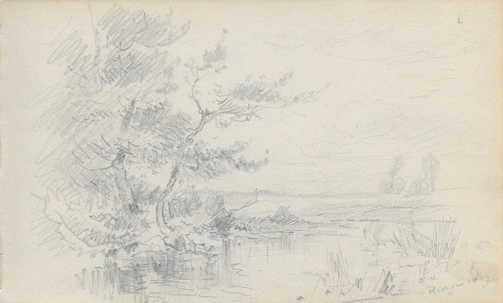 C62 Crayon par Émile Noirot (Roanne (Loire), 5 juin 1853 † St-Germain-des-Fossés (Allier), 5 juin 1924), 6ème dessin du carnet C (feuille 130*210 mm), Monogrammé, situé et daté en bd E N. | Riorges 1909. Vue prise dans cette commune du roannais représentant une nappe d’eau bordée à droite par deux arbres et des taillis, arrière-plan esquissé