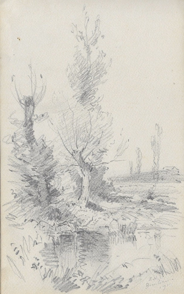 C71 Crayon par Émile Noirot (Roanne (Loire), 5 juin 1853 † St-Germain-des-Fossés (Allier), 5 juin 1924), 15ème dessin du carnet C (feuille 130*210 mm), Monogrammé, situé et daté en bd E N. | Beaulieu | 1911. Titre partiellement forgé. Format portrait. Vue prise dans le domaine de Beaulieu à Riorges près de Roanne avec au premier plan une étendue d’eau, derrière deux arbres et taillis, au loin à droite trois peupliers et une maison.